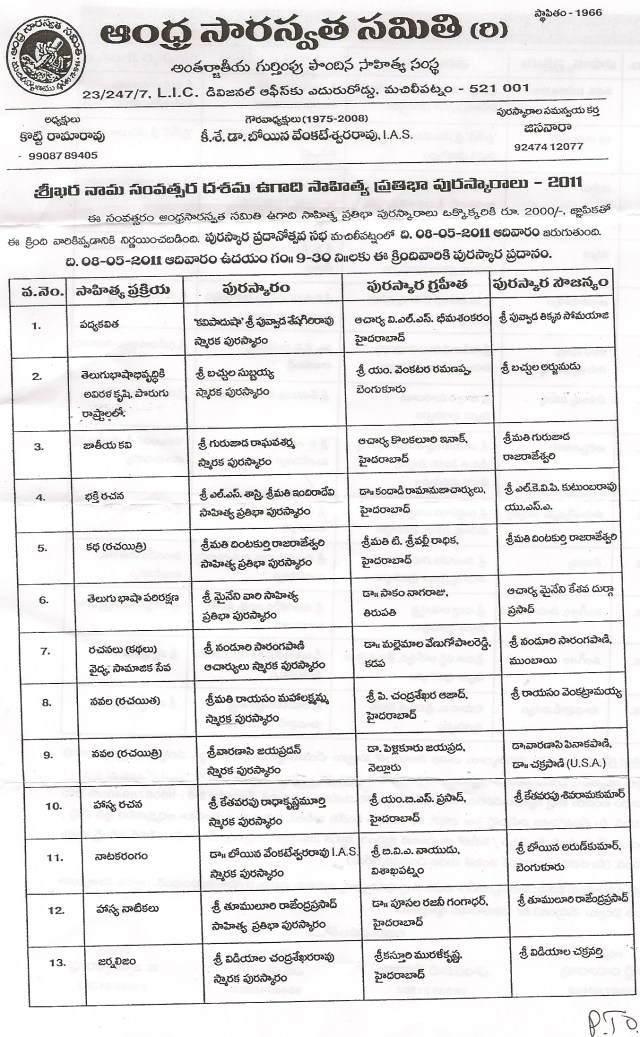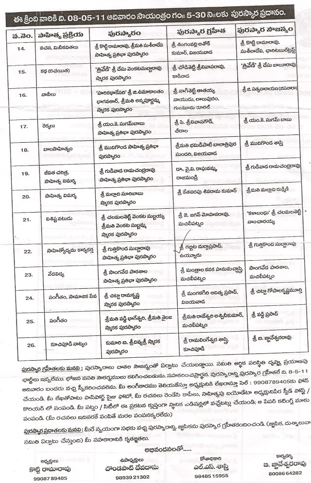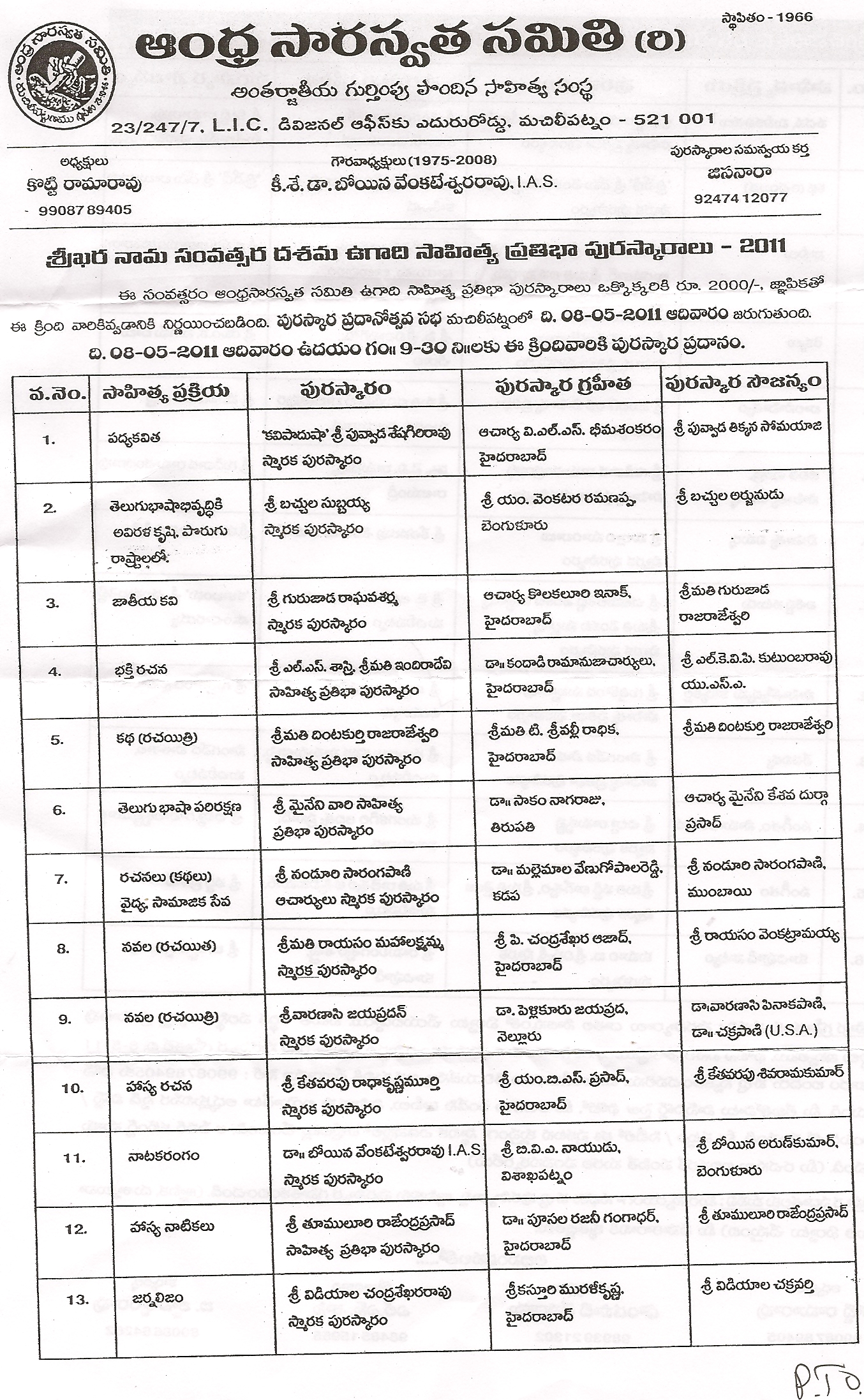 ఆంధ్ర సారస్వత సమితి ఉగాది పురస్కారాలు మచిలీపట్నం 08-05-2011 ఆహ్వానం