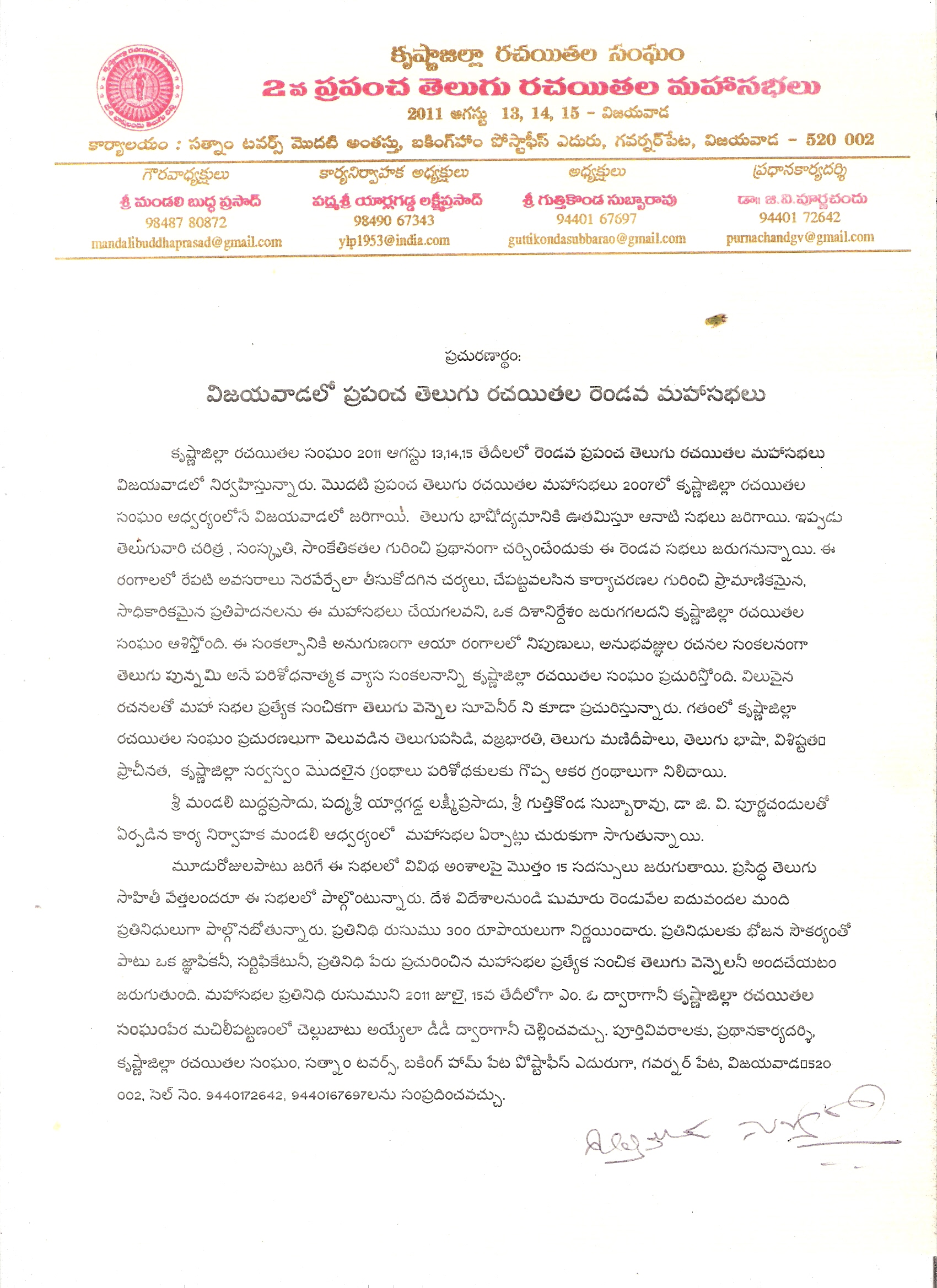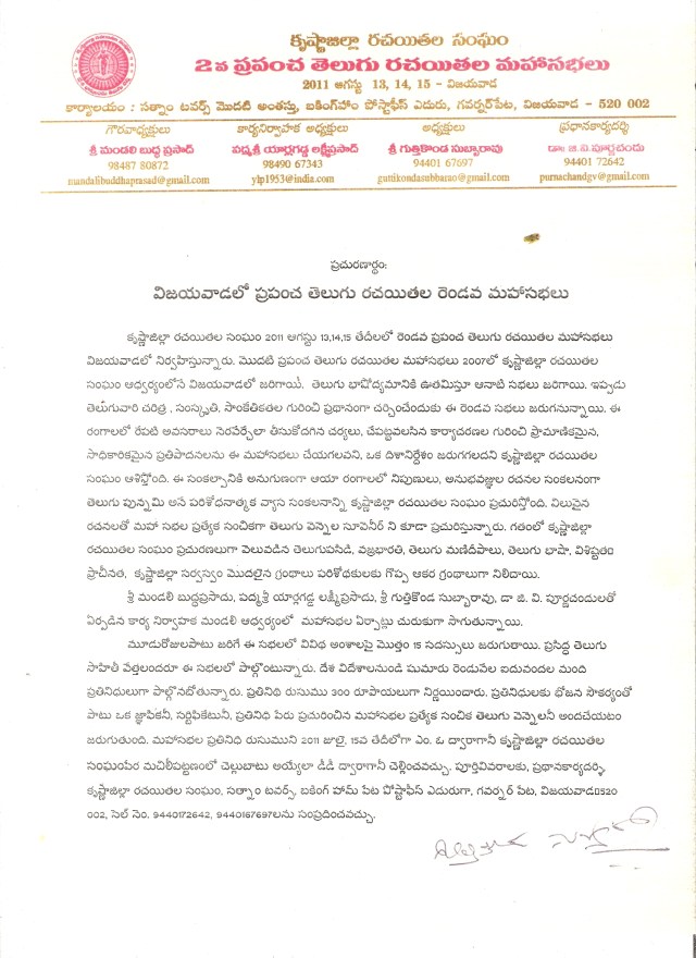 రెండవ ప్రపంచ తెలుగు మహా సభ విజయవాడ – కృష్ణా జిల్లా రచయతల సంఘం ఆగస్ట్ 13,14,15