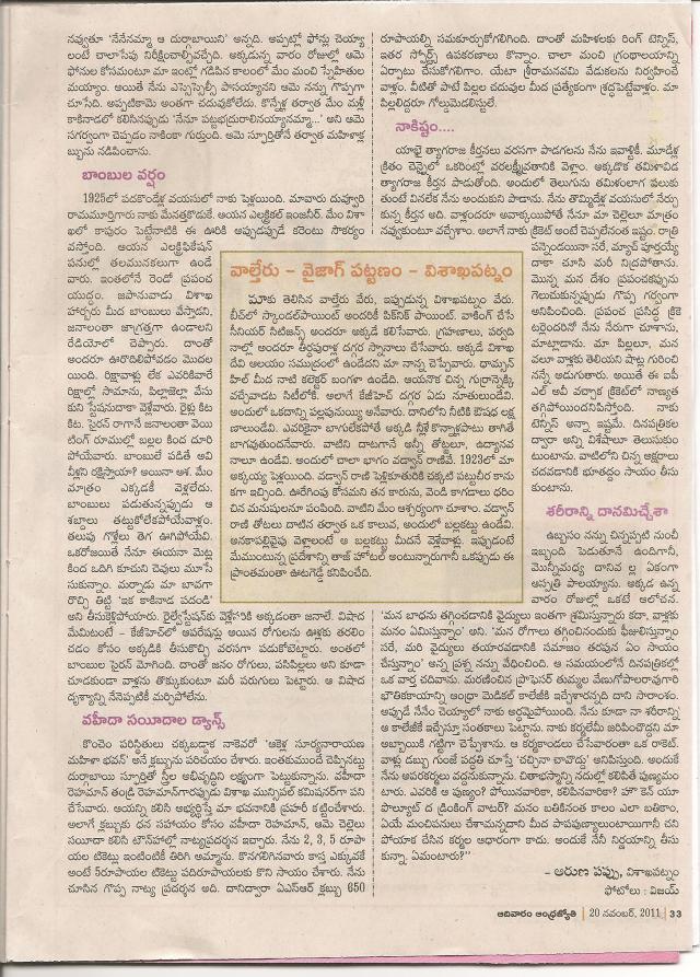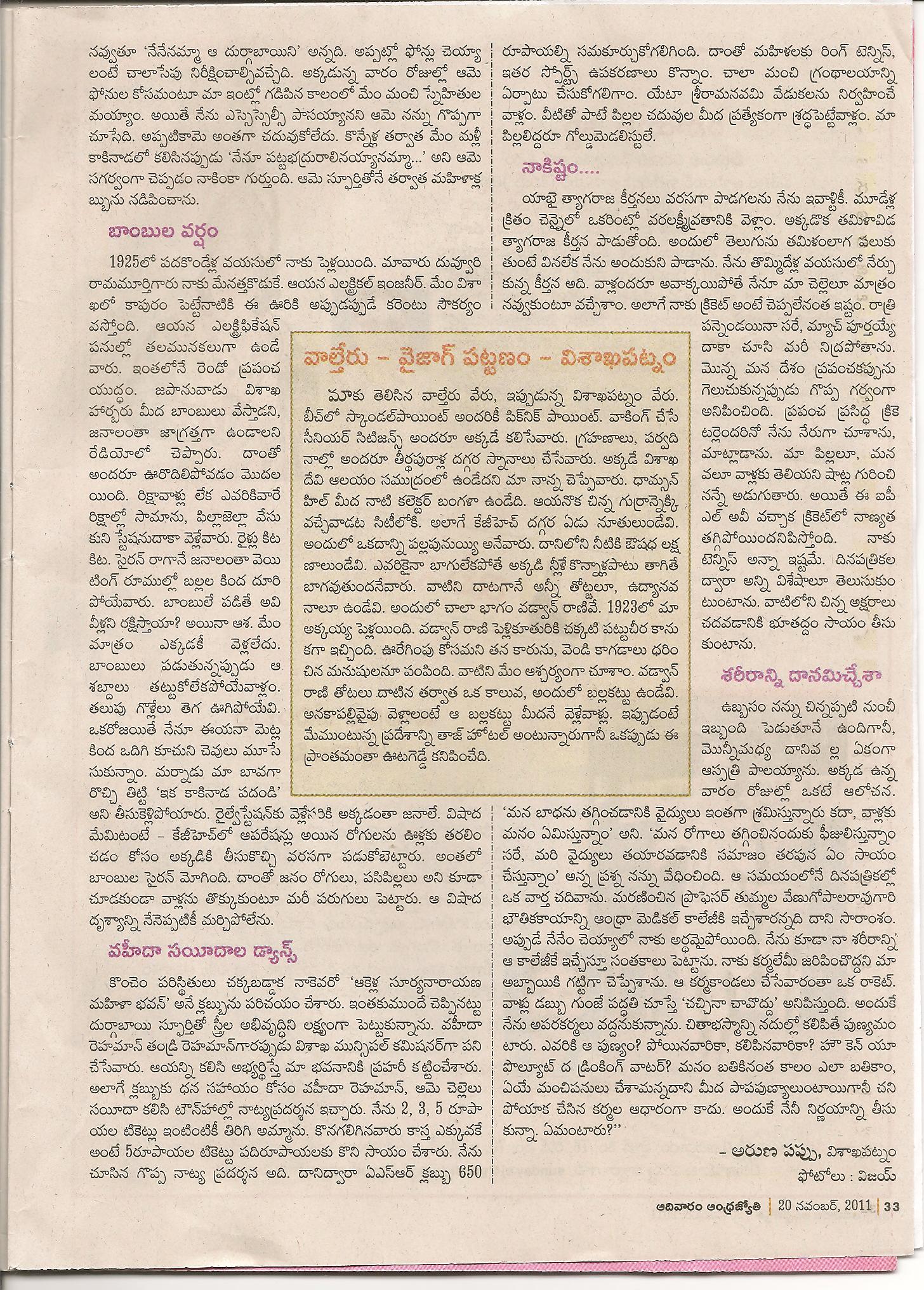 చదువుతుంటే ఒక్కసారి ఒళ్ళు పులకరించింది. ఎన్నెన్ని విషయాలు అంతకుముందు విన్నవి, వాటిలోకొన్ని విషయాలకి లంకెలు కలుస్తూ… అరుణగారూ, మీ ఈ వ్యాసం చాలా పదిలంగా దాచుకోవలసిన కొన్ని చారిత్రక విషయాలను విశదీకరించింది. మా నాన్నగారు ఒకసారి విశాఖపట్టణం కలెక్టరు విశాఖలోని వ్యాపారులు నిత్యావసర వస్తువుల్ని అధికధరలకు అమ్ముతుంటే, వాళ్ళకి ఎన్ని హెచ్చరికలు చేసినా వినకపోవడంతో, “ఒకే ఒక గంటసేపు” ప్రజలకి “లూటీ” చేసుకుందికి అనుమతి ఇచ్చేరని చెప్పగా విన్నాను. ( అంతే కాదు అందులో మహాబలవంతుడైన మా పెదనాన్నగారు ఒక బస్తా బియ్యపుమూటని అలవోకగా మోసుకుని తెచ్చేసేరని కథగా చెబుతుండేవారు… వాళ్ళప్పుడు కనకమహలక్ష్మి గుడిదగ్గర ఉండేవారట…). అది ధృవపరుచుకుందికి ఇంకెవరూ దొరకలేదు. మీరు ఆ విషయాన్ని దయయుంచి లలితాంబగారిని కనుక్కోగలరా?
