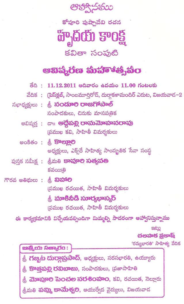 ‘హృదయ కాంక్ష ”కవితా సంపుటి ఆవిష్కరణ .ఆహ్వానం