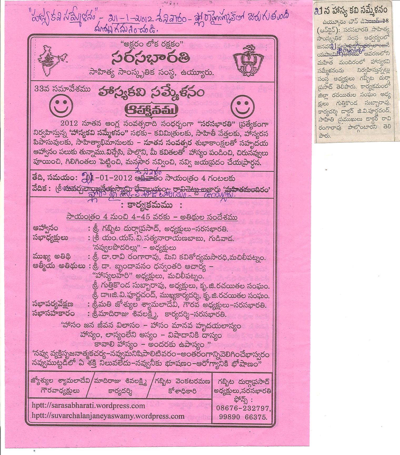 3) సరస భారతి ఈ కొత్త వత్సరం మొదటి రోజు నిర్వహించాలనుకొన్న” హాస్య కవి సమ్మేళనం ”పెను వర్షం మూలంగా వాయిదా వేశాం .కొత్త సంవత్సరం లో భలే ఝలక్ ఇచ్చింది వాన .