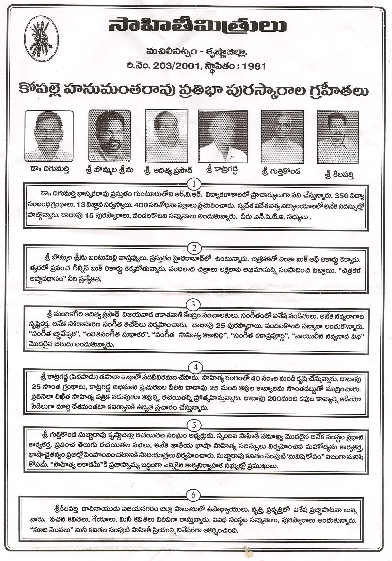 సాహితీ మిత్రులు అనే మచిలీ పట్నం లో ని సాహిత్య సంస్థ 31 వ వార్షి కోత్స వాన్ని ఈ రోజూ 22 -01 -12 ఉదయం నుంచి సాయంత్రం దాకా ”మహతి కళా వేదిక ”పై నిర్వ హిస్తోంది శ్రీ కిల పర్తి దాలి నాయుడు రాసిన ”సూది మొనలు ”అనే మినీ కవితా సంకలనాన్ని , శ్రీ మతి ఓలేటి ఉమా సరస్వతి సంపాదకత్వం లో వెలువడిన ”పద్య పుష్పకం ‘అనే గ్రంధాలను ఆవిష్కరిస్తున్నారు వివిధ రంగాలలో లబ్ధ ప్రతిష్టు లైన అయిదుగురు ప్రముఖులను సత్కరిస్తున్నారు .వారి వివ రాలే మీరు చూస్తున్నది
