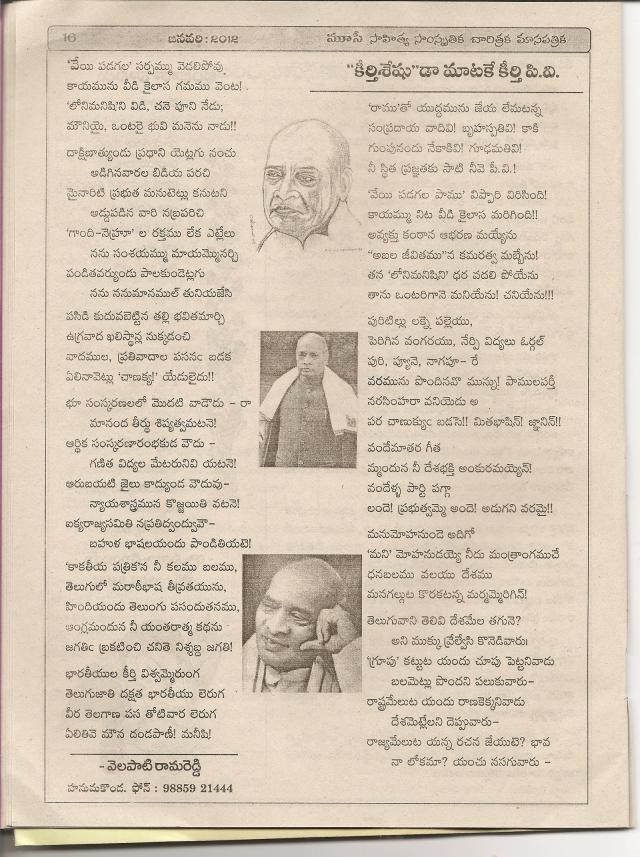 నాకు పీ.వీ గారంటే వల్లమానిన అభిమానం.. కారణం చెబితే కొంతమదికి ఇష్టం వుండదు.. కర్ర విరగొట్టకుండా పాముని చచ్చేలా చేసిన గొప్ప వ్యక్తి.. నేను బతికున్న కాలం ఆ మహనీయుని స్మరించుకుంటాను.. మా లాంటి ప్రభుత్వ వుద్యోగస్తులకి గొప్ప వరాన్ని, ప్రేవేట్ రంగం ఇలా దిన దినా భివృధి జరగడానికి కృషి చేసిన మహానుభావుడు.. కొడిగట్టిన దీపాలను తన చేతితో అడ్డుకొని వెలుగులని పంచేలా చేసిన దివ్య పురుషుడు..