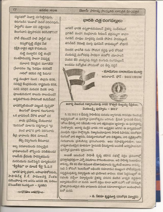 డిసెంబర్ లో విజయ వాడ లో కవయిత్రి, కధా రచయిత్రి శ్రీ మతి కోపురి పుష్పా దేవి గారు ,తన పుస్తకావిష్కరణ సందర్భం గా చేసిన సత్కారం .ఇందులోని ప్రముఖులు -ఎడమనుంచి శ్రీ నండూరి రాజా గోపాల్ -చినుకు మాస పత్రిక సంపాదకులు- ,శ్రీ అద్దె పల్లి రామ మోహన రావు ప్రముఖ కవి ,విమర్శకులు -,శ్రీ విహారి ,xప్రసిద్ధ కవి కధా రచయిత ,విమర్శకులు -శ్రీ కొల్లూరి,