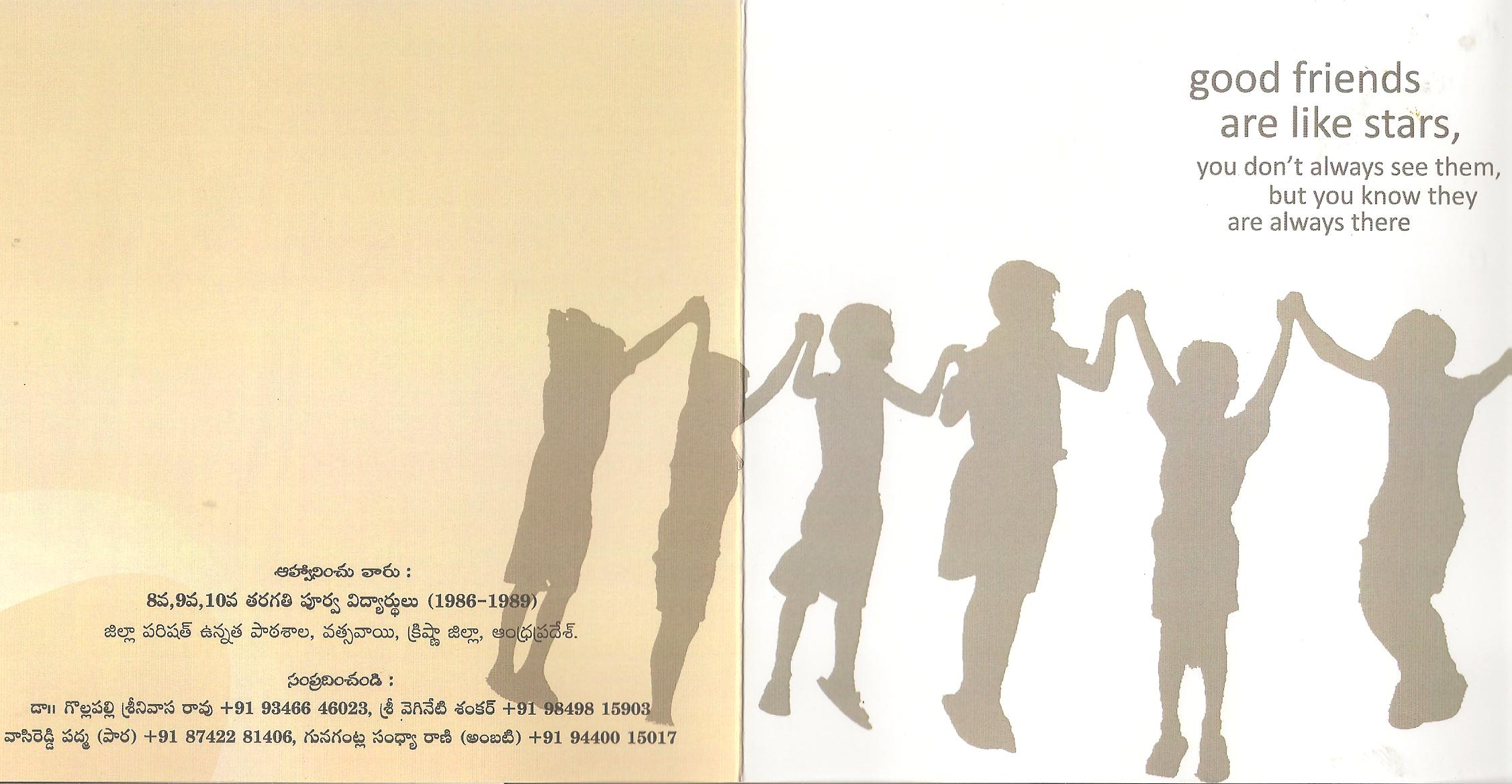 ” కార్య క్రమాన్ని పూర్వ విద్యార్ధులందరూ తమ గ్రామాల్లో తాము చదువు కొన్న విద్యాలయాలలో జరుపు కొంటు ,ఆ విద్యాలయ అభి వృద్ధికి తమ వంతు సేవ లందించటం చాల శుభ పరిణామం..ఈ ప్రేరణ నిలవాలి .మీరు భవిష్యత్ తరాలకు ఆదర్శం అవాలి .వీలైనప్పుడల్లా కలుసు కొంటు ,,స్పూర్తిని పొందుతూ ,మీ తరువాతి తరానికి ప్రేరణ నిస్తూ ముందుకు కదలాలని ఆకాంక్షిస్తున్నాను .నాకోసం మీరు పనిగట్టు కోని వచ్చి ఆహ్వానాన్ని మా ఇంట్లో అందించటం నాకు మహదానందం గా ఉంది .ఉయ్యూరు లో ఉంటె తప్పక వచ్చి మీ ఆనందం లో భాగస్వామిని ఆయె వాడిని .సుదూరం లో ఉండటం వల్ల మీకు నా శుభాకాంక్షలను మెయిల్ ద్వారా పంప వలసి వచ్చింది .నేను తప్పక రాసి పంపాలని మీరందరూ కోరటం మీ సహృదయతకు నిదర్శనం .మీ అందరికి మరో సారి అభి నందనాలు .కార్య క్రమం అందరి సహకారం తో వైభవో పేతం గా ,ఉత్సాహ భరితం గా విజయ వంతం గా జరగాలని మనస్పూర్తి గా కోరు కుంటు, జరుగు తుందని నమ్ముతున్నాను ..—మీ గబ్బిట దుర్గా ప్రసాద్ —17 -05 -12 .