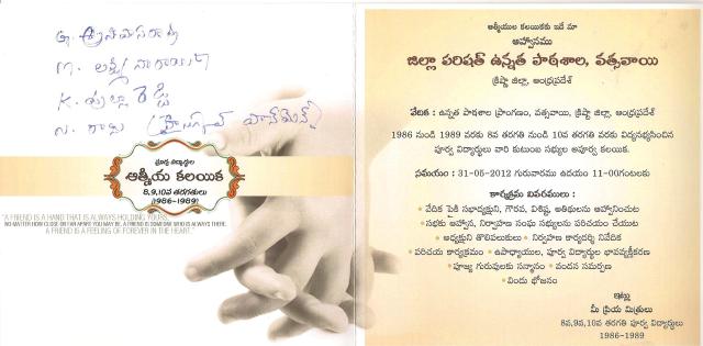 ప్రియ మైన చిరంజీవులకు శుభాశీ స్సులు .మీరందరూ కలిసి ఒక చారిత్రాత్మక మైన పూర్వ విద్యార్ధుల సమా వేశాన్ని నిర్వహించటం చాలా ఆనందం గా ఉంది .సుమారు ఇరవై మూడు సంవత్సరాల క్రితం వత్సవాయి ఉన్నత పాటశాలను వదిలిన మీరు మళ్ళీ ఆత్మీయత ,అనురాగాలను మేళవించుకొని మాత్రు సంస్థ ఆవరణ లో కలుసుకొని ,మీ అనుభూతులను నెమరు వేసుకొని ,మీరు ఆ విద్యాలయానికి ఏరూపం గా మీ సేవలు అందించి దాన్ని అన్ని విధాలా అభివృద్ధి పధం లోకి తీసుకు వెళ్ళే ప్రయత్నం చేయాలో అని ఆలోచించ టానికి ఈ సమావేశం ఏర్పాటు చేశారని భావిస్తాను .మీ ఆశయానికి నా మనస్పూర్తి అభినందనలు ,మీ అందరికి శుభా కాంక్షలు .నేను మొదటి సారిగా ఆ విద్యాలయం లో పదోన్నతి ని పొంది ,ప్రదానో పాద్యాయునిగా 1987 -88 .లో పని చేశాను .అన్ని వసతులు ఉన్నా విద్యలో వెనుక బడి ఉండటం బాధ వేసింది .మీరందరినిఉత్సాహ పరచి ,ప్రత్యెక తరగతులను నిర్వ హించి ,హాస్టల్ విద్యార్దులకు కూడా ప్రత్యెక క్లాసులు నిర్వ హించి మీలో ప్రేరణ కల్గించాను .దీనికి నాకు విద్యాలయం లో అందరు ఉపాధ్యాయుల సహకారం మీ సహకారం లభించింది అక్కడ ఏమైనా మంచి జరిగితే అది ఆ విద్యా కుటుంబం యొక్క గొప్పతనమే .వ్యక్తిది కాదు .సమర్ధులైన ఉపాధ్యాయులు నేను పని చేసిన కాలమ్ ఉండటం నా అదృష్టం .విద్యాలయం చేసుకొన్న అదృష్టం ..అది మరువలేని విషయం .విద్యార్దులుగా మీరు ఆ నాడు కొంచెం అలసత్వం చూపినా మంచి ని చెప్పే వారిని గౌరవించటం మరువ లేనిది .మీరందరూ జీవితం లో ఏదో ఒక సంతృప్తి కరమైన వ్రుత్తి లో స్థిర పడి ఉంటారని ఆశిస్తున్నాను .మాతృదేశం ,మాత్రు సంస్థ లతో మన అనుబంధం శాశ్వత మైనవి .వాటిని కంటికి రెప్ప లాగా కాపాడు కోవాలి .వాటి అభివృద్ధి లో మనం పాలు పంచుకోవాలి.గురువులను గౌరవించటం అందు లో ఒక భాగం .ఈ శుభ సందర్భం లో మీరు మీ గురువులను సత్కరిస్తున్నారని తెలిసి ఆనందం గా ఉంది .