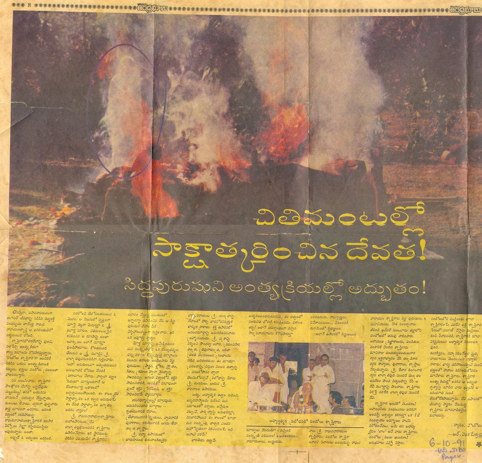 ( 10-12-1990ప్రమోదూత మార్గ శిర బహుళ నవమి నాడు శాస్త్రి గారు బాలా త్రిపుర సుందరి అమ్మ వారి ఒడిలోకి శాశ్వతం గా చేరి పోయారు .వారి పార్ధివ దేహానికి అగ్ని సంస్కారం చేస్తున్నప్పుడు అమ్మ వారి ఆకారం గా చితి మంటలు ఆకాశానికి లేవటం ఎందరో చూసి పరమాద్భుతం గా వర్ణించారు .)