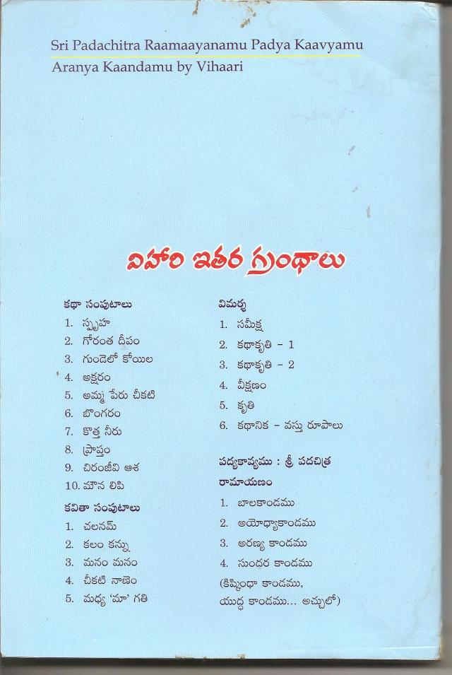 తెలుగు కధా సీమలో అలవోక గా విహరించి ,విమర్శ అరణ్యం లో వీర విహారం చేసి ,ఇప్పుడు పద చిత్ర రామాయణం లో సభక్తికం గా విహరిస్తున్న ఆప్తులు శ్రీ విహారి గారికి –మనః పూర్వక ప్రణామాలు .ఉభయ కుశలోపరి –