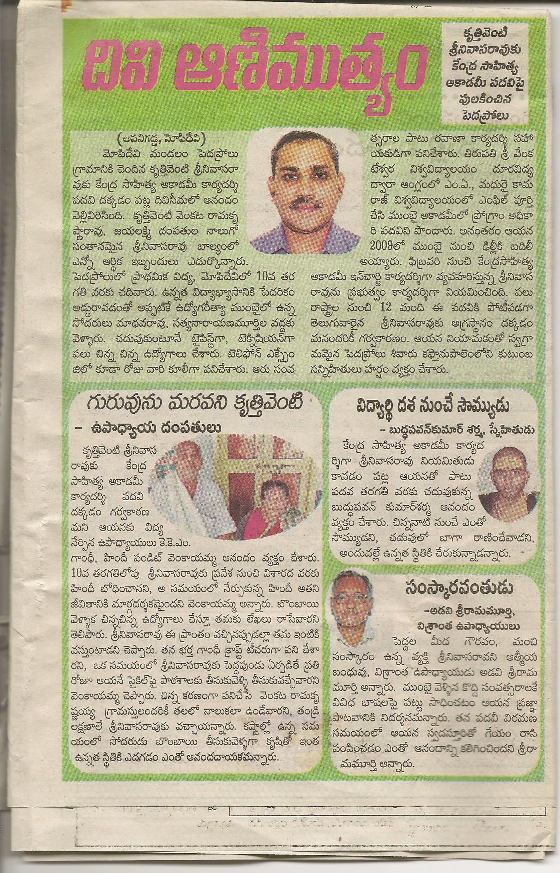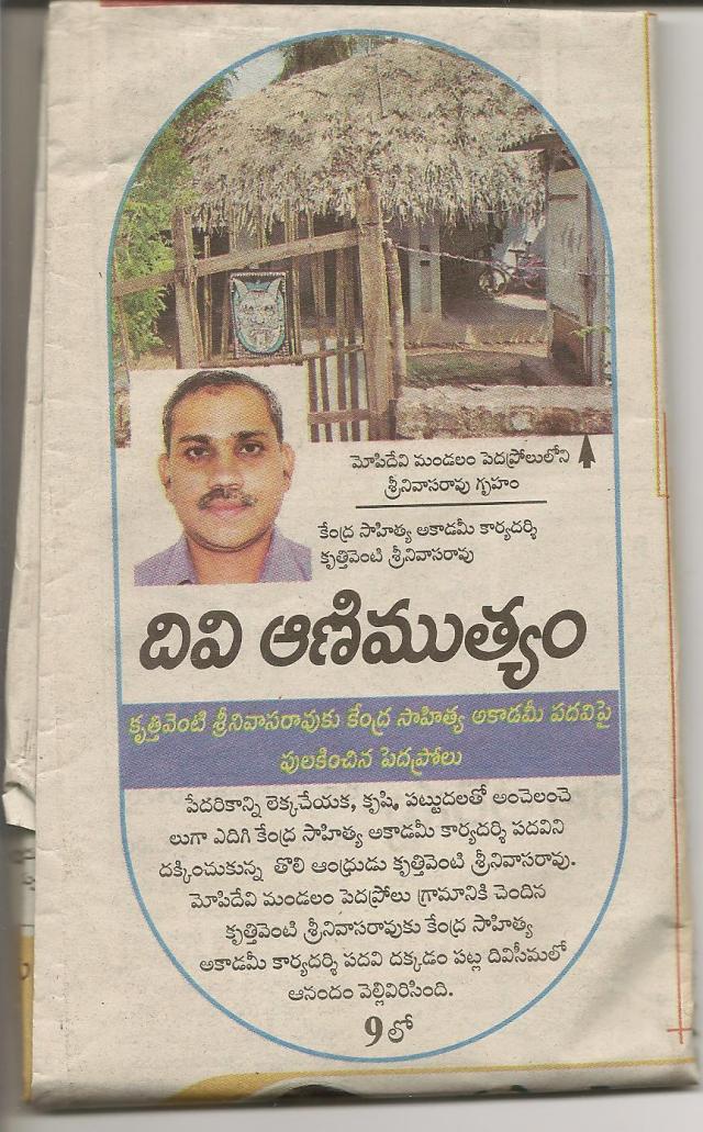 దివి ఆణిముత్యం ..కృత్తి వెంటి శ్రీనివాసరావు కు కేంద్ర సాహిత్య అకాడమీ పదవి