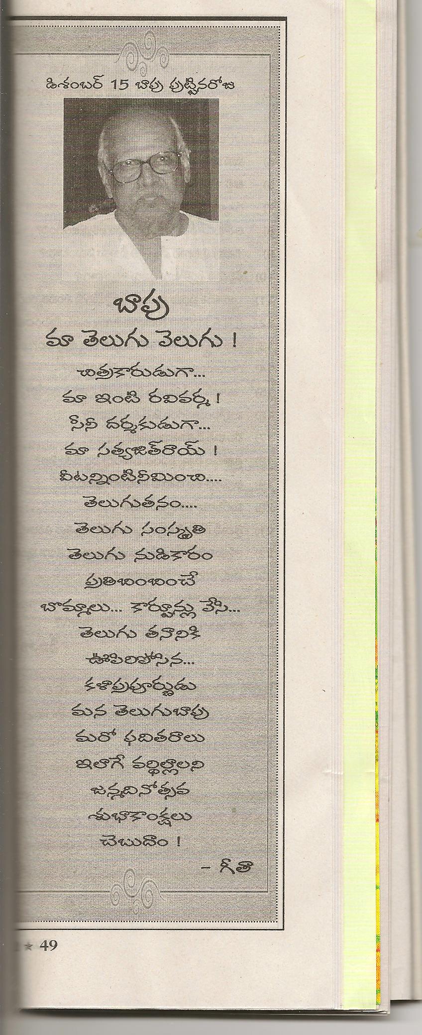 ← తెలుగు సభల చిహ్నం -దాని వివరణ మరియు బాపు గారి పుట్టిన రోజు కు ”గీతా”గారి గీతం