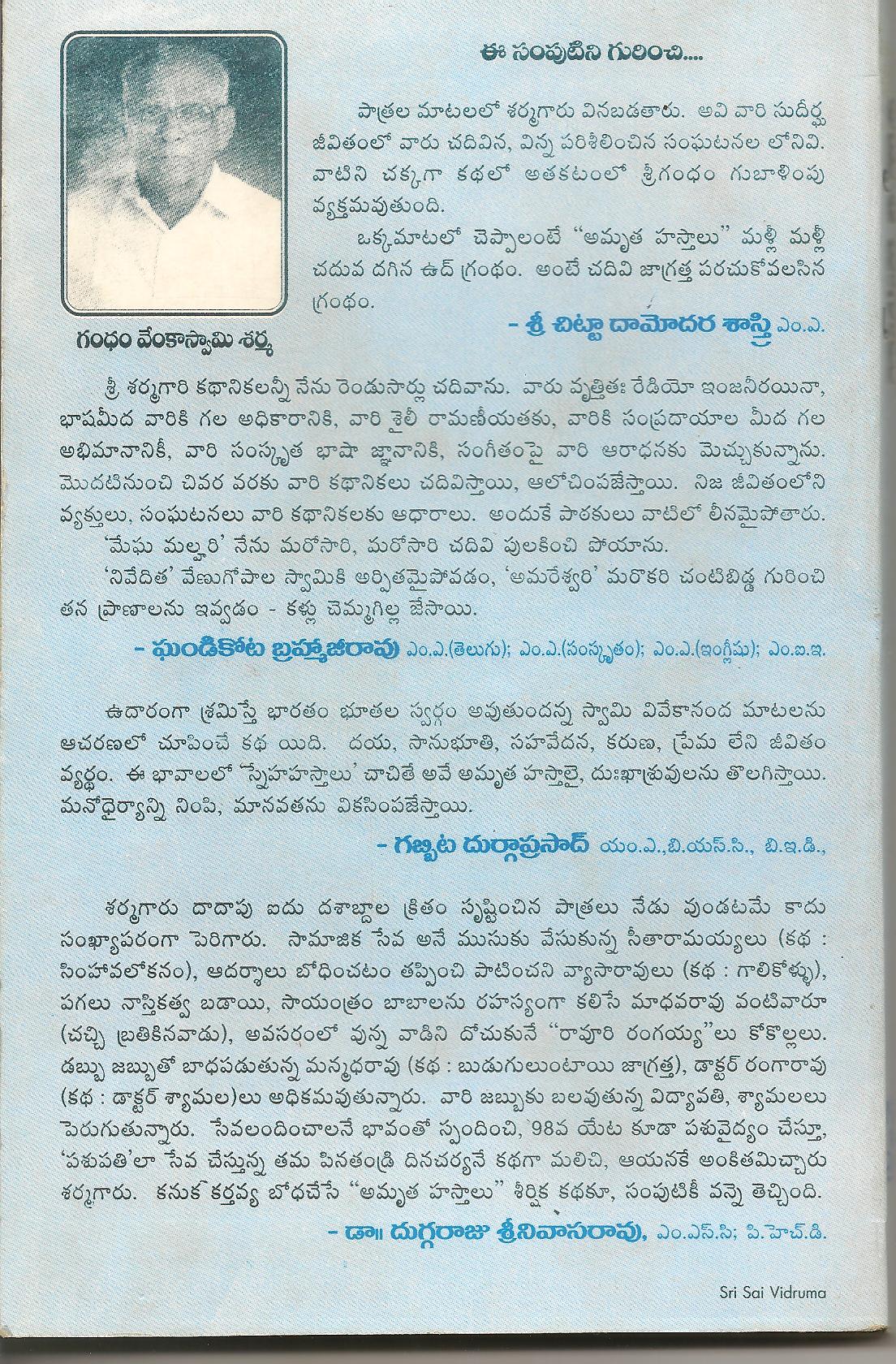 సుమారు అర్ధ శతాబ్ది గా కదా ప్రస్తానం చేస్తూ ,తాను రచించి ,ప్రచురణ ,ప్రసారణ పొందిన ముచ్చటైన 28కధలను ”అమృత హస్తాలు ”అనే కదా సంపుటి గా చదువరుల అమృత హస్తాలను అలంకరింప జేశారు స్వర్గీయ గంధం వేం కా స్వామి శర్మ గారు .వీరికి ”చైతన్య ”అని కలం పేరుంది .అందుకే ప్రతి కధలో చైతన్యం ఉన్న రచన కని పిస్తుంది .వస్తు వైవిధ్యమూ ఉ న్నది .జీవితం లో తాను చూసిన ,విన్నా ,ప్రేరణ పొందిన యదార్ధ ఘటనలకు తన దై న శైలి లో అద్భుతం గా కదా గానం చేశారు .ఆ విషయాలను ఆయా కధల చివరలో తెలియ జెప్పి ,ప్రేరణకు కారకు లైన తన బంధువులకు ,మిత్ర ,సహచరులకు కృతజ్ఞతలు తెలుపు కొన్నారు .జీవితం నుంచే ఈ కధలు పుట్టాయి కనుక సహజ సుందరం గా ఉన్నాయి .అవసర మైన చోట్ల చలువ పందిళ్ళు అల్లారు .రేడియో ఇంజినీర్ ఉద్యోగిత్వం వల్ల సహస్రాధిక మహాను భావులతో పరిచయం ,అందులోను రచయితల కళా కారుల తీరు తేన్నుల్ని పరిశీలించే నేర్పు అవకాశము కలిగాయి అందుకే నే ల విడిచి సాము చేయని రీతిలో కధలు రాశారు. రాసి మెప్పించారు .సహజ సుందర మైన హృదయం ఆర్ద్రత నిండిన మనసు ,పరోప కార పారాయణ త్వం ,అమృత తుల్యమైన మాట .విద్యుక్త ధర్మం లో తృప్తీ ఉన్న వారు కనుక శ్రీ శర్మ గారు కధలన్నీ నిండుగా ,అమృత పానం గా ,ఆనంద మయం గా ఉన్నాయి .ఈ కధలన్నీ సుగంధాన్ని వేద జల్లేవి కనుక నేను ఈ సమీక్షను గంధం వారి పేరు కూడా కలిసి వచ్చేట్లు ”కదా గంధం ”అనితొమ్మిదేళ్ళ క్రితం రాశాను .ఇందులో కొంత భాగాన్ని శర్మ గారు ఈ కదా సంపుటిలో చేర్చి ప్రచురించారు .