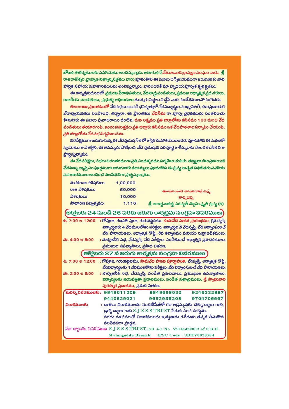 కావున ఆస్తిక మహాశయులందరూ ఈ 4 రోజుల సభలలో పాల్గొని ఆ వేదవేద్యుడైన రాజరాజేశ్వర స్వామి అనుగ్రహాన్ని, అలాగే వేదమాత అనుగ్రహాన్నికూడా పొందవలసినదిగా ప్రార్ధన.