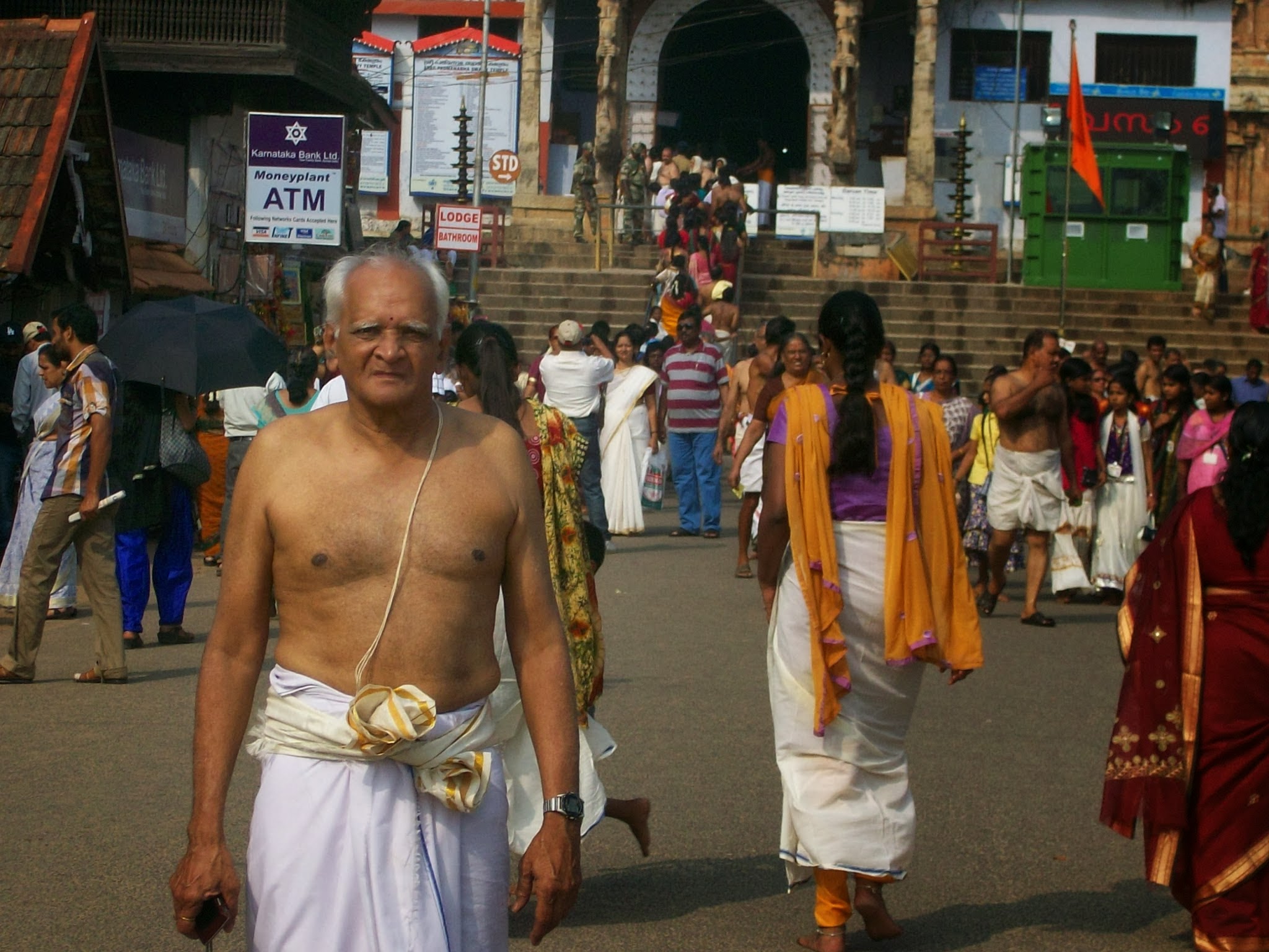 ఎనిమిది గంటలకు ఏ.సి.మినీ వాన్ లో ఎక్కాం .మేము కాక ఇంకో దంపతులు మాత్రమె ఉన్నారు .మొదటగా శ్రీ అనంత పద్మ నాభ స్వామి దేవాలయానికి తీసుకొని వెళ్ళారు .అక్కడ పాంటు చొక్కా కెమెరాలు ,సెల్ ఫోన్లు చెప్పులు క్లోక్ రూమ్ లో ఇచ్చి లుంగీ పై పంచ మాత్రమె వేసుకొని నేను రాం బాబు తయారయ్యాం