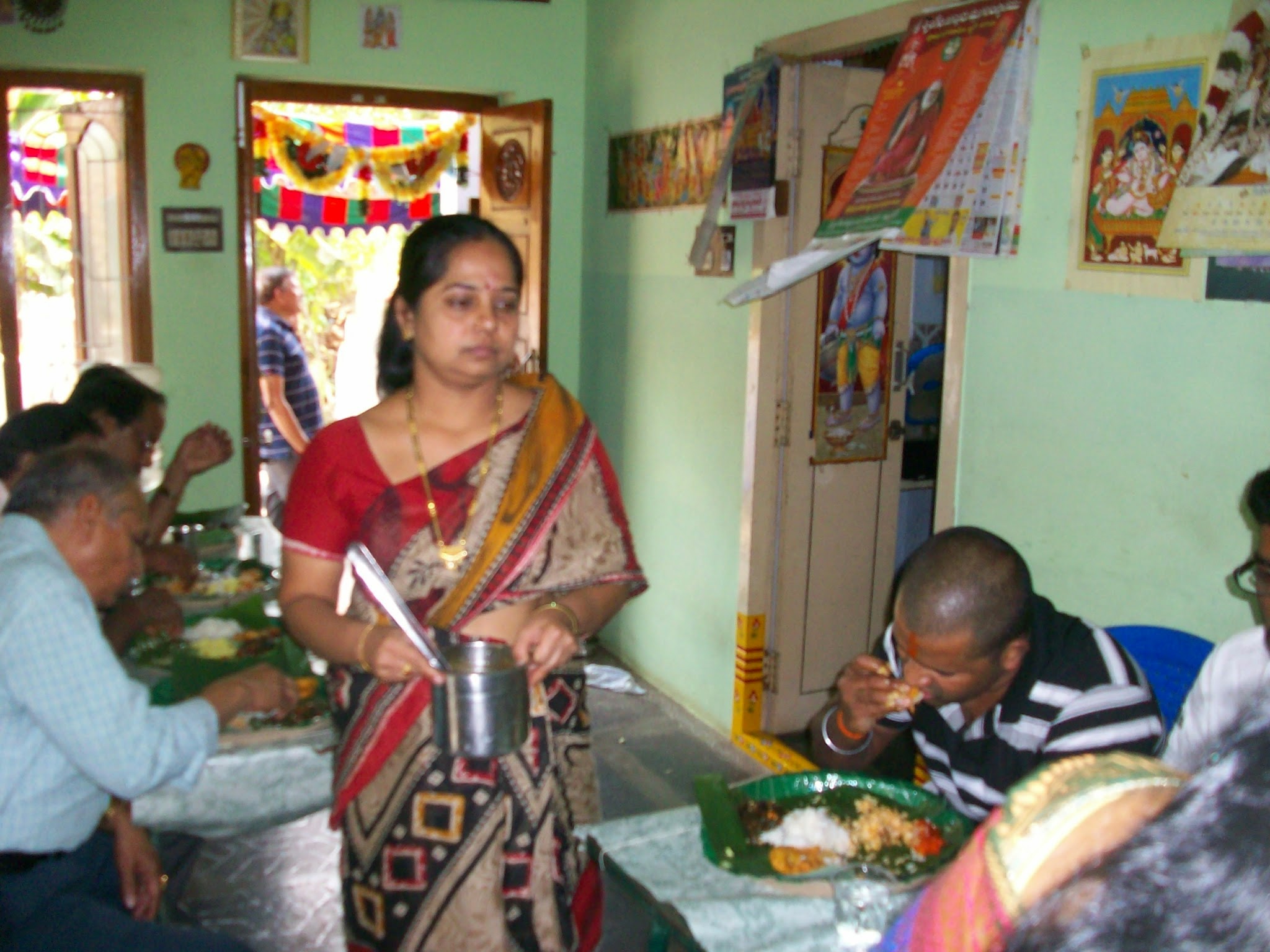 మా ఇంట్లో హాల్ లో టేబుల్స్ వేసి కోడళ్ళు వడ్డించారు .మామిడి కాయ పప్పు ఆవకాయ వంకాయ కూర దోసకాయ పచ్చడి పూర్ణం బూరెలు పులిహోర ,వడియాలు సాంబారు గడ్డ పెరుగు మా పెరటి లో పండిన అమ్రుతపాణి అరటి పండ్లు తాంబూలం తో కమ్మని విందుఏర్పాటు చేశాము
