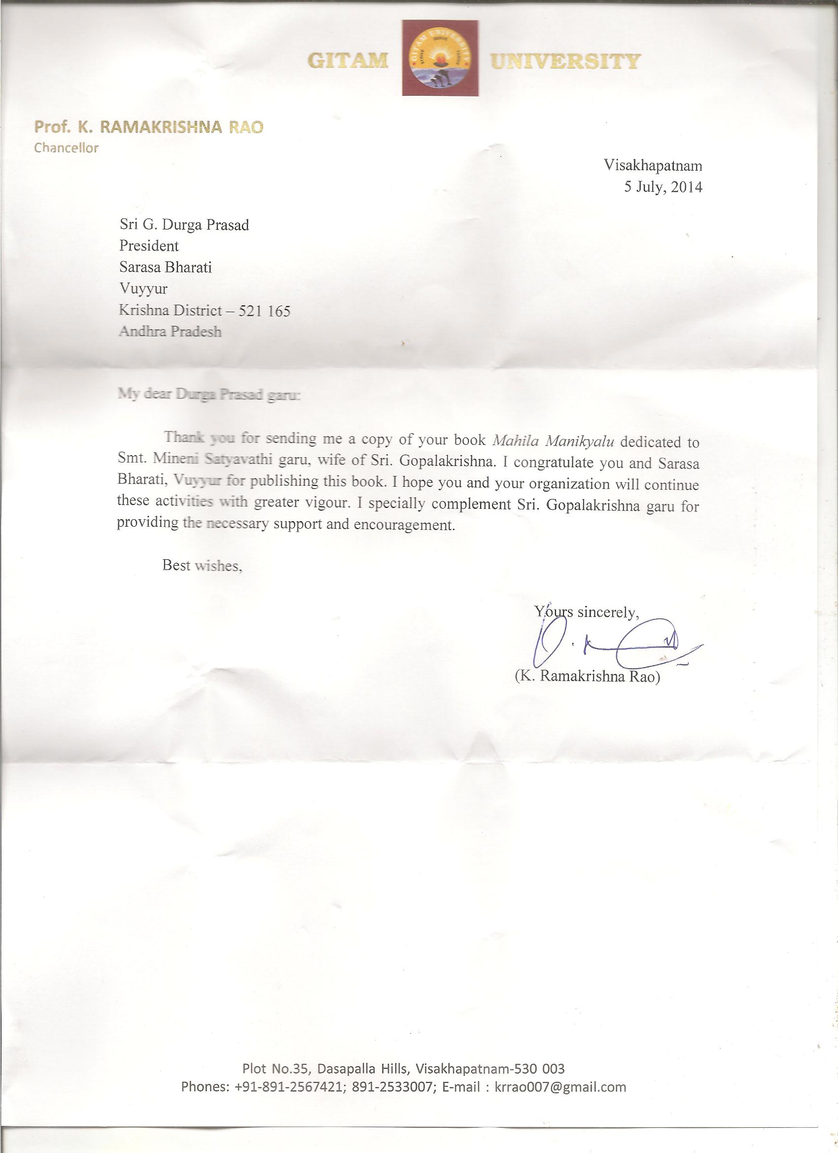 ఆంద్ర విశ్వ విద్యాలయ మాజీ వైస్ చాన్సెలర్ ప్రస్తుత గీతం యోని వర్సిటి చాన్సెలర్ పద్మశ్రీ కోనేరు రామ కృష్ణా రావు గారి స్పందన