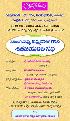 విజయవాడ టాగూర్ గ్రంధాలయం లో14-9-14 ఆదివారం ఉదయం పది గంటలకు పై మూడు సంస్థలు నిర్వహిస్తున్న ”గాలి వాన ”కధకు అంతర్జాతీయ గుర్తింపు తెచ్చిన స్వర్గీయ పాలగుమ్మి పద్మ రాజు గారి శత జయంతి సభ జరుగుతుంది అందరూ ఆహ్వానితులే . సరసాభారతికి ఆత్మీయులు ,అమెరికా వాసి శ్రీమైనేని గోపాల కృష్ణ గారు ఏర్పరచిన ”బాపు -రమణ స్మారక నగదు పురస్కారం” 5,000రూపాయలు కదా రచనలో అద్వితీయ సేవ లందిస్తున్న శ్రీ వేదగిరి రాం బాబు గారికి సరసభారతి ద్వారా ఈ సభలో ప్రదానం చేయ బడుతుందని తెలియ జేస్తున్నాం –గబ్బిట దుర్గా ప్రసాద్