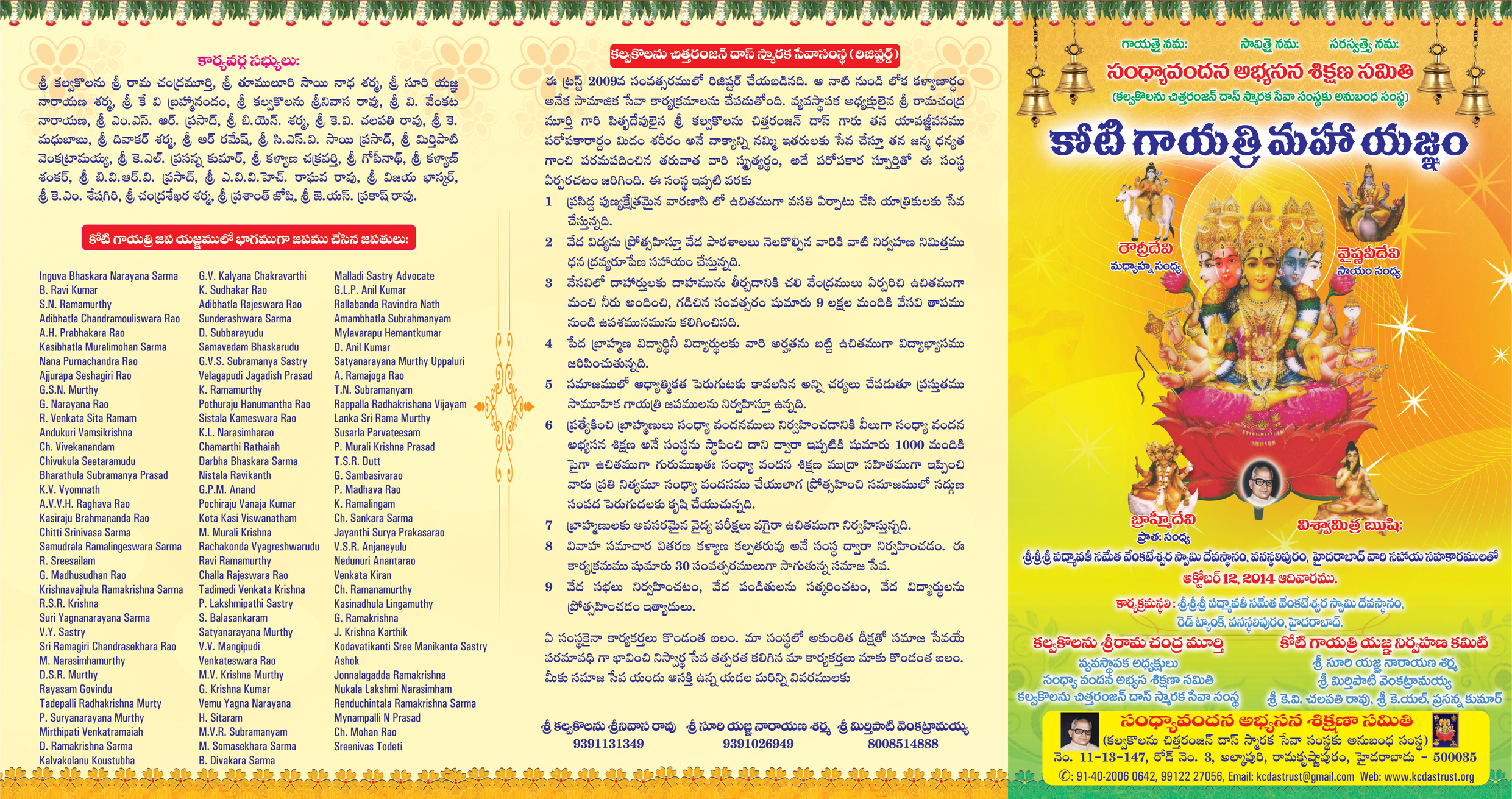 కల్వకొలను చిత్తరంజన్ దాస్ స్మారక సేవ సంస్థ కు అనుబంధ సంస్థ ఐనటువంటి సంధ్య వందన అభ్యాసన శిక్షణ సమితి ద్వారా ఇప్పటివరకు షుమారు వేయి మందికి సంధ్య వనదనములో శిక్షణ ఇప్పించి వారిలో అనుష్టానాసక్తి పెంచి అందులోనించి ఒక వంద మంది జపతులను ఎంపిక చేసి వారితో గత వంద రోజులుగా నిత్యమూ సహస్ర గాయత్రి జపము , తర్పణాలు జరిపించి ఇప్పుడు  కోటి గాయత్రి హోమము ,  పూర్ణాహుతి కార్యక్రము  ఈ అక్టోబర్ నెల 12 వ తారీకున , ఆదివారం , వనస్తలిపురములోని శ్రీ శ్రీ శ్రీ పద్మావతి సమేత వెంకటేశ్వర స్వామి దేవస్థానములో నిర్వహించ తలపెట్టామ