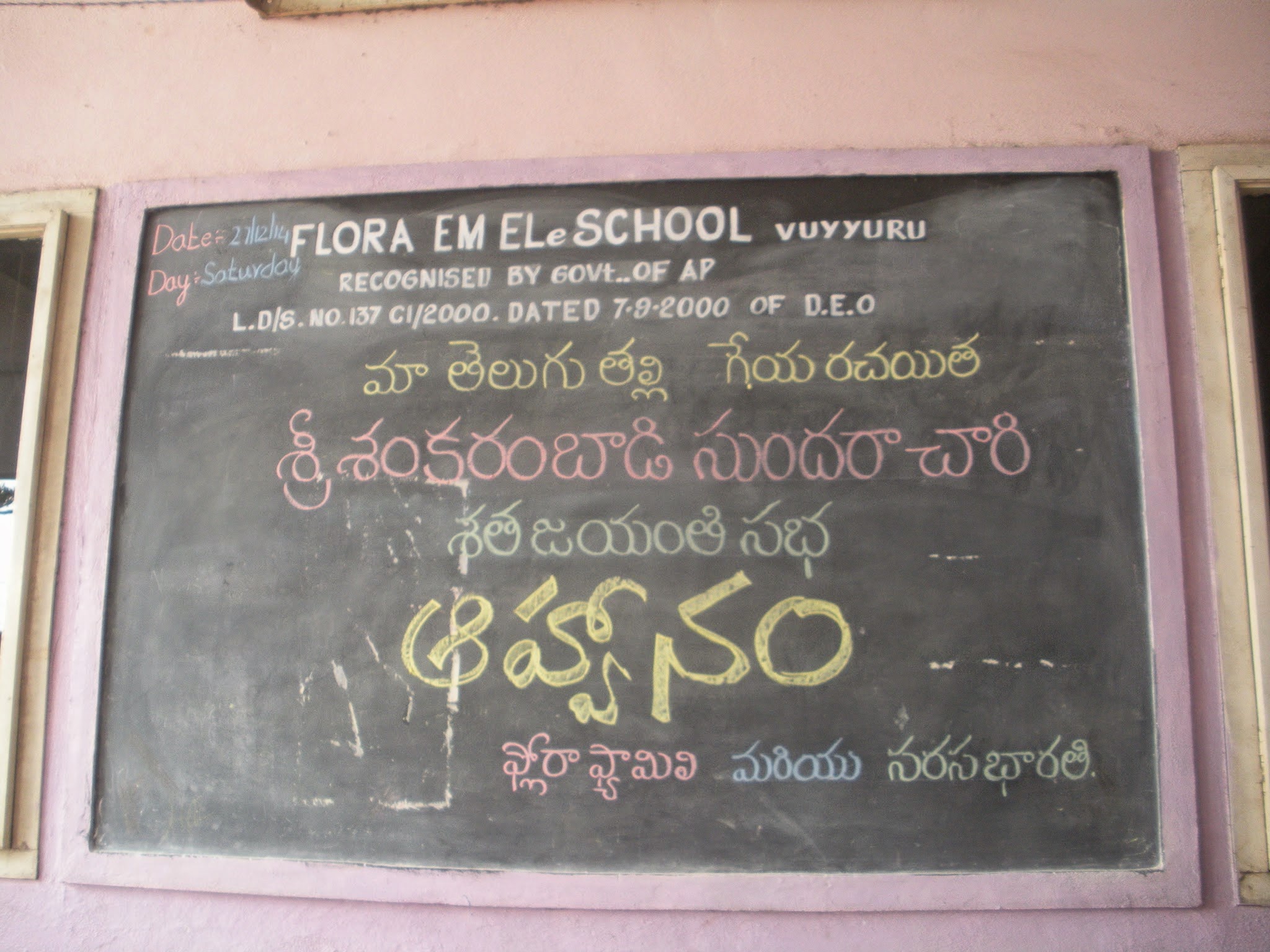 ← మా తెలుగు తల్లి గేయ రచయితస్వర్గీయ శంకరంబాడి సుందరాచారి గారి శత జయంతి సభ సరసభారతి, ఫ్లోరా స్కూల్ సంయుక్త ఆధ్వర్యం లోఫ్లోరా స్కూల్ లో శనివారం 27-12-14