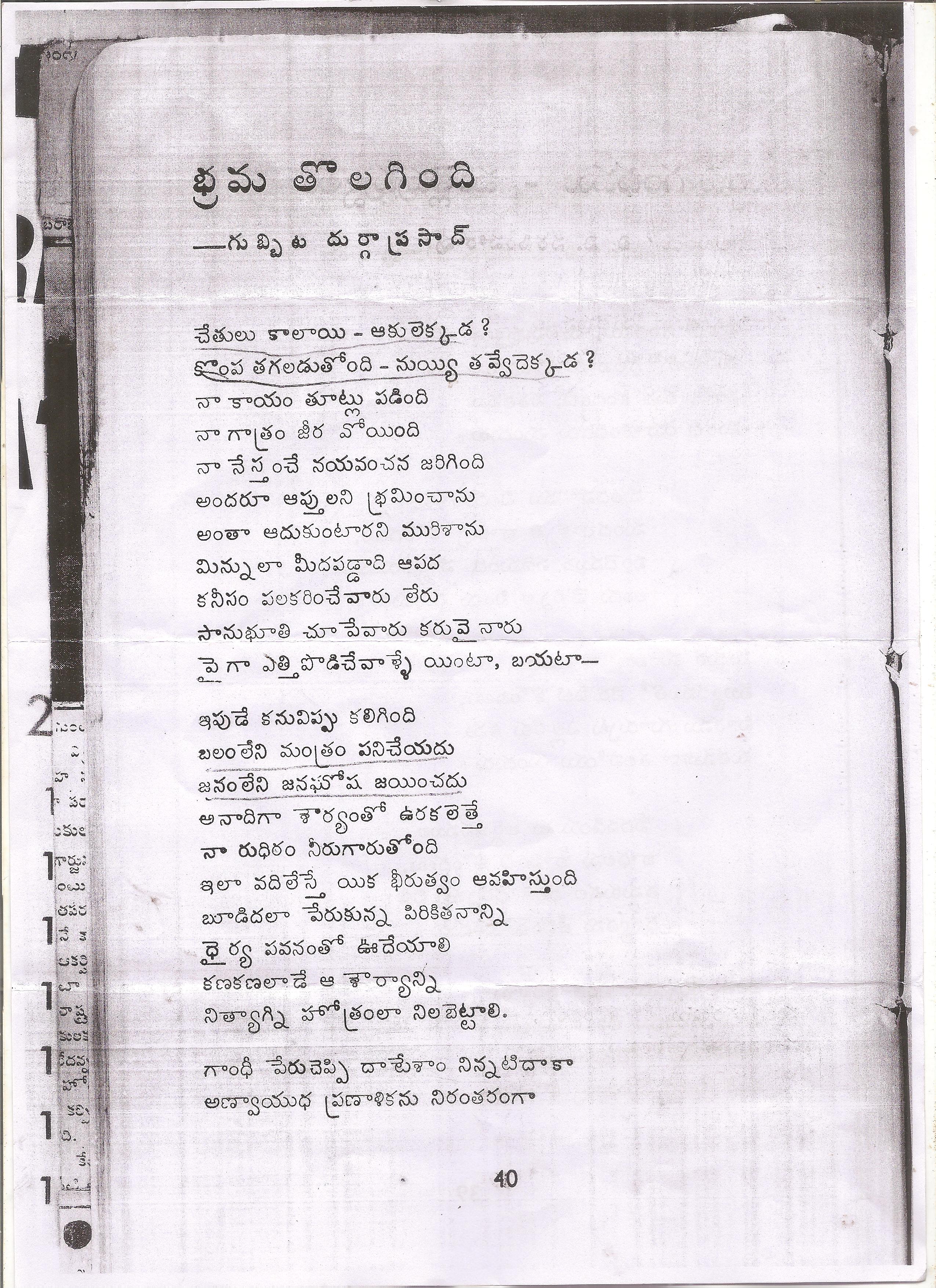 సాహితీ బంధువులకు శుభకామనలు -ఎప్పుడో 1969 లో అంటే 45 ఏళ్ళక్రితం ,నా ఆదర్శ కదా రచయిత ఆత్మీయులు స్వర్గీయ ఆర్ ఎస్ కె మూర్తి గారు అడిగితె రాసిన కవిత ”భ్రమ తొలగింది ”మచిలీపట్నం ఆంద్ర సారస్వత సమితి వారు ముద్రించిన మొదటి పుస్తకం లో చోటు చేసుకొన్నది .దాన్ని ,బందరుకు చెందిన సాహితీ మూర్తి శ్రీ జ్ఞానేశ్వరరావు గారి కుమార్తె శ్రీమతి గుడిపూడి రాదికారాణి సేకరించి ,భద్రపరచి జిరాక్స్ కాపీ తీయించి నిన్న జరిగిన శ్రీ మన్మధ ఉగాది వేడుకలలో పాల్గొనటానికి వచ్చి నాకు ఏంతో ఆత్మీయం గా ముద్దుముద్దు మాటలతో అందజేసింది ఆ కవిత రాసిన విషయం ఎప్పుడో మర్చిపోయాను అది సమితి వారు ముద్రించిన పుస్తకం లో ఉందన్న సంగతీ నాకు తెలీదు లేక గుర్తు లేదు .ఈ క వితను పది రోజుల ముందు రాధికా రాణి నాకు ఫోన్ లో చదివి వినిపించి నన్ను ఆశ్చర్య పరచింది నా కవిత వేనకే బాలబందు స్వర్గీయ శ్రీ బి వి నరసింహా రావు గారి ”మంచి గంధము -మల్లెపువ్వులు ”కవిత కూడా ఉంది . ఆకవిత ఆయనలాగానే మంచిగంధపు చల్లదనాన్ని మల్లె పూల సోయగ ,సౌరభాలను వె ద జల్లుతుంది దాన్నికూడా మీ కోసం అందజేస్తున్నాను -దుర్గాప్రసాద్