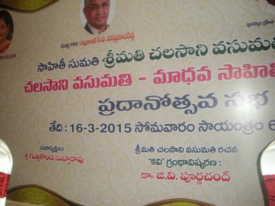 ← విజయవాడ ”మానర్ ఫుడ్ ప్లాజా ”లో 16-3-15 సోమవారం రాత్రి శ్రీమతి చలసాని వసుమతి గారు ,మహా కధకులు శ్రీ విహారి గారికి మహా చిత్రకారులు శ్రీ వీర్రాజు గారికి చెరొక 25,౦౦౦ రూపాయల నగదు ను ”వసుమతి -మాధవ ”పురస్కారం గా అంద జేసిన దృశ్యమాలిక