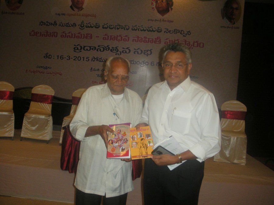 ← విజయవాడ ”మానర్ ఫుడ్ ప్లాజా ”లో 16-3-15 సోమవారం రాత్రి శ్రీమతి చలసాని వసుమతి గారు ,మహా కధకులు శ్రీ విహారి గారికి మహా చిత్రకారులు శ్రీ వీర్రాజు గారికి చెరొక 25,౦౦౦ రూపాయల నగదు ను ”వసుమతి -మాధవ ”పురస్కారం గా అంద జేసిన దృశ్యమాలిక