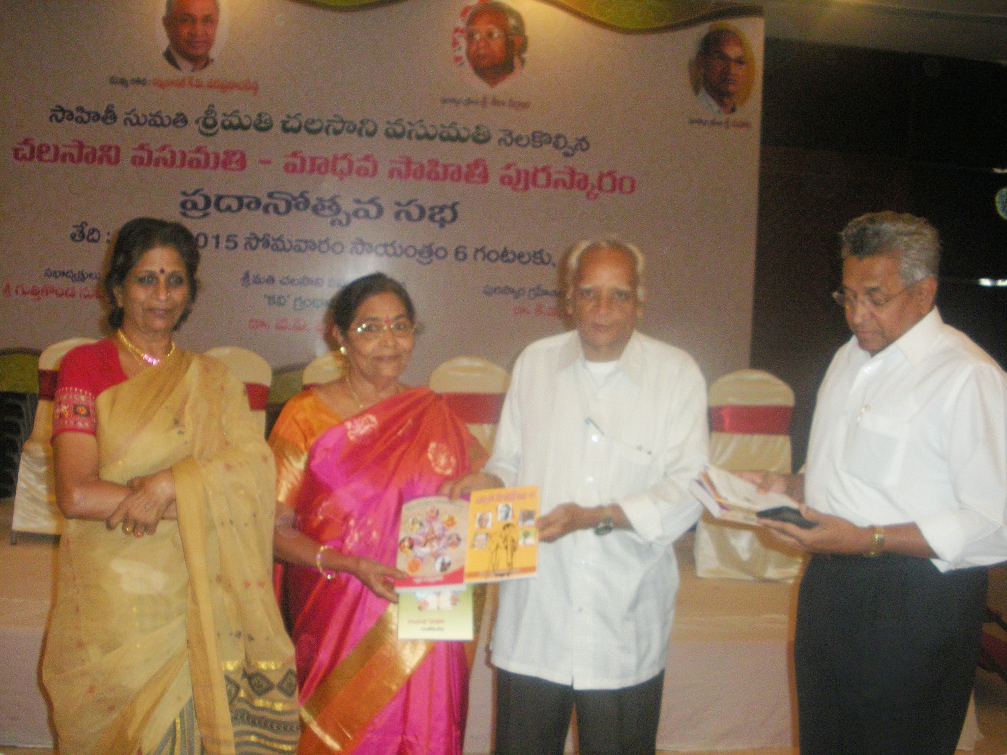 ← విజయవాడ ”మానర్ ఫుడ్ ప్లాజా ”లో 16-3-15 సోమవారం రాత్రి శ్రీమతి చలసాని వసుమతి గారు ,మహా కధకులు శ్రీ విహారి గారికి మహా చిత్రకారులు శ్రీ వీర్రాజు గారికి చెరొక 25,౦౦౦ రూపాయల నగదు ను ”వసుమతి -మాధవ ”పురస్కారం గా అంద జేసిన దృశ్యమాలిక