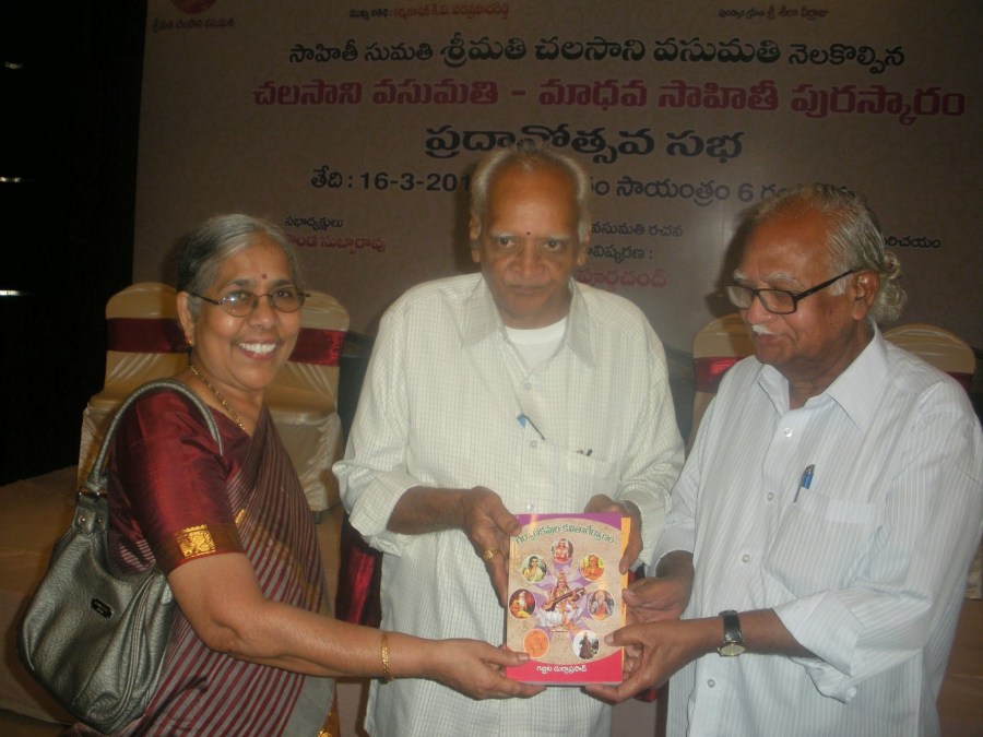 ← విజయవాడ ”మానర్ ఫుడ్ ప్లాజా ”లో 16-3-15 సోమవారం రాత్రి శ్రీమతి చలసాని వసుమతి గారు ,మహా కధకులు శ్రీ విహారి గారికి మహా చిత్రకారులు శ్రీ వీర్రాజు గారికి చెరొక 25,౦౦౦ రూపాయల నగదు ను ”వసుమతి -మాధవ ”పురస్కారం గా అంద జేసిన దృశ్యమాలిక