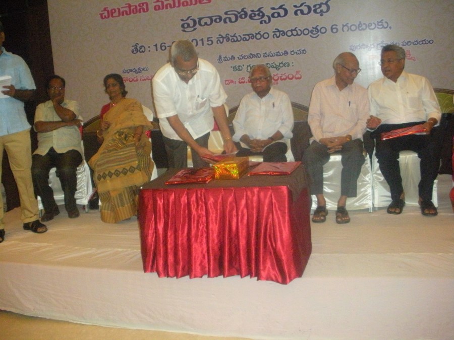 ← విజయవాడ ”మానర్ ఫుడ్ ప్లాజా ”లో 16-3-15 సోమవారం రాత్రి శ్రీమతి చలసాని వసుమతి గారు ,మహా కధకులు శ్రీ విహారి గారికి మహా చిత్రకారులు శ్రీ వీర్రాజు గారికి చెరొక 25,౦౦౦ రూపాయల నగదు ను ”వసుమతి -మాధవ ”పురస్కారం గా అంద జేసిన దృశ్యమాలిక
