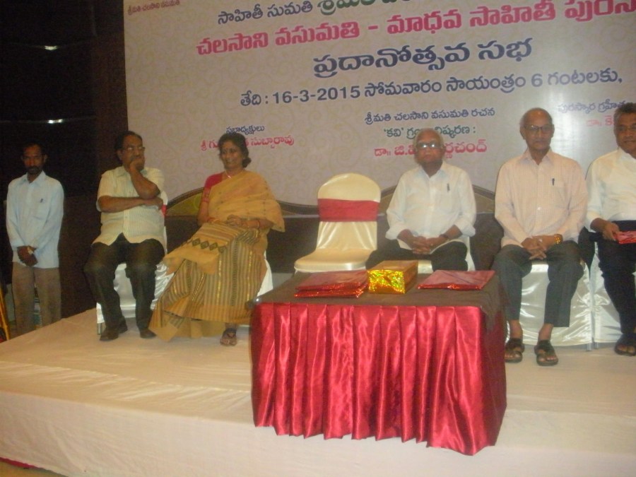 ← విజయవాడ ”మానర్ ఫుడ్ ప్లాజా ”లో 16-3-15 సోమవారం రాత్రి శ్రీమతి చలసాని వసుమతి గారు ,మహా కధకులు శ్రీ విహారి గారికి మహా చిత్రకారులు శ్రీ వీర్రాజు గారికి చెరొక 25,౦౦౦ రూపాయల నగదు ను ”వసుమతి -మాధవ ”పురస్కారం గా అంద జేసిన దృశ్యమాలిక