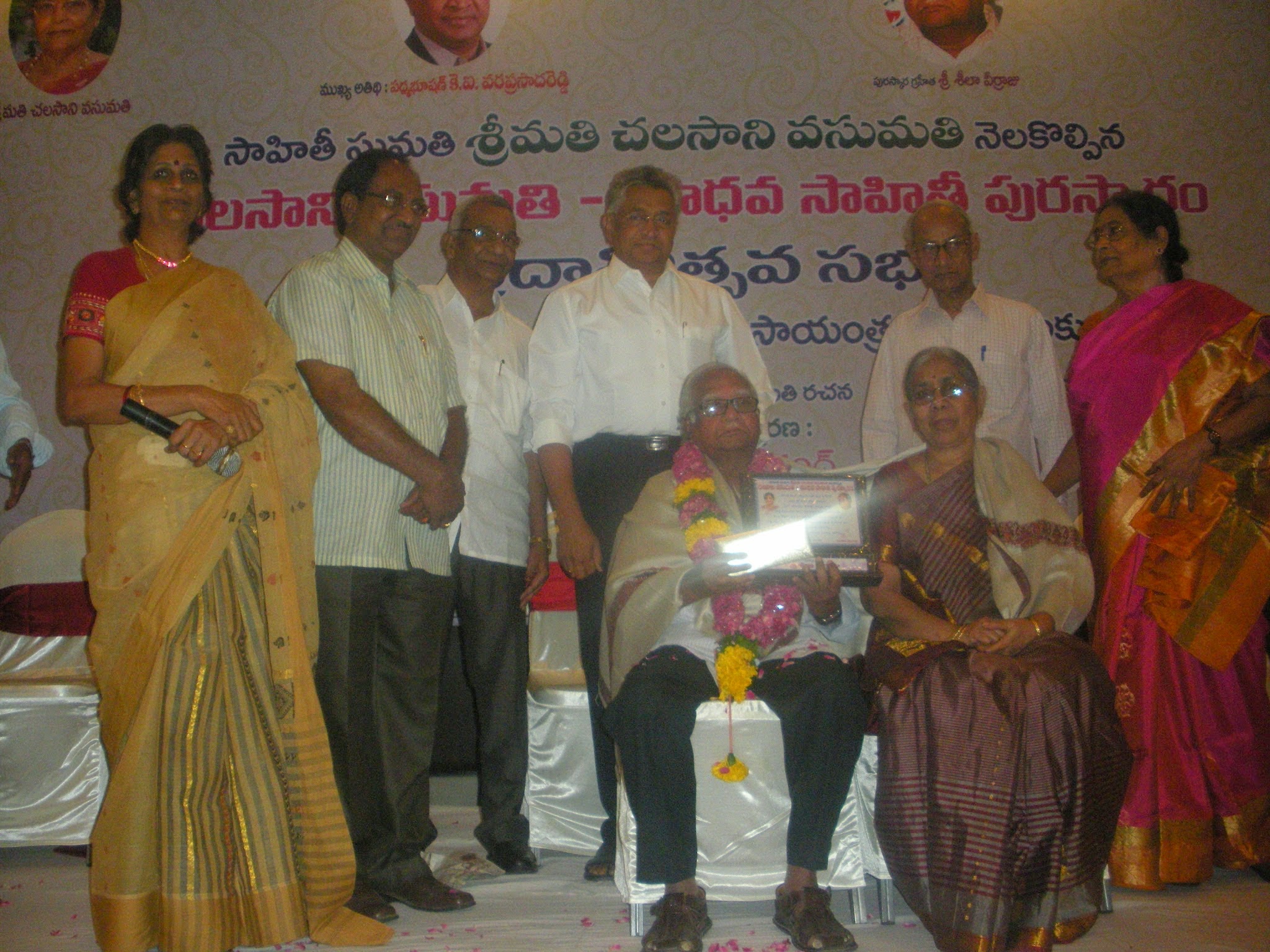 ← విజయవాడ ”మానర్ ఫుడ్ ప్లాజా ”లో 16-3-15 సోమవారం రాత్రి శ్రీమతి చలసాని వసుమతి గారు ,మహా కధకులు శ్రీ విహారి గారికి మహా చిత్రకారులు శ్రీ వీర్రాజు గారికి చెరొక 25,౦౦౦ రూపాయల నగదు ను ”వసుమతి -మాధవ ”పురస్కారం గా అంద జేసిన దృశ్యమాలిక