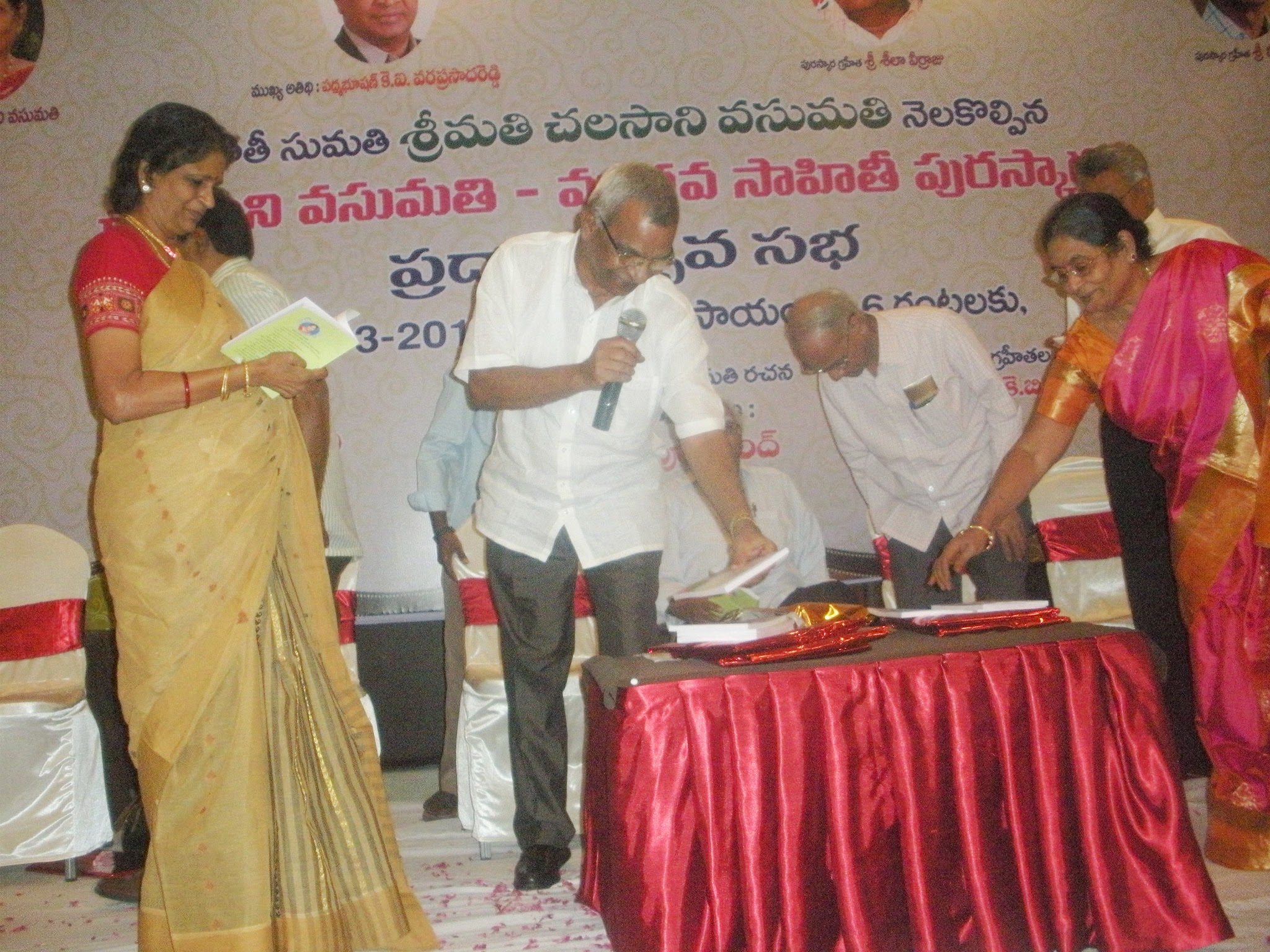 ← విజయవాడ ”మానర్ ఫుడ్ ప్లాజా ”లో 16-3-15 సోమవారం రాత్రి శ్రీమతి చలసాని వసుమతి గారు ,మహా కధకులు శ్రీ విహారి గారికి మహా చిత్రకారులు శ్రీ వీర్రాజు గారికి చెరొక 25,౦౦౦ రూపాయల నగదు ను ”వసుమతి -మాధవ ”పురస్కారం గా అంద జేసిన దృశ్యమాలిక