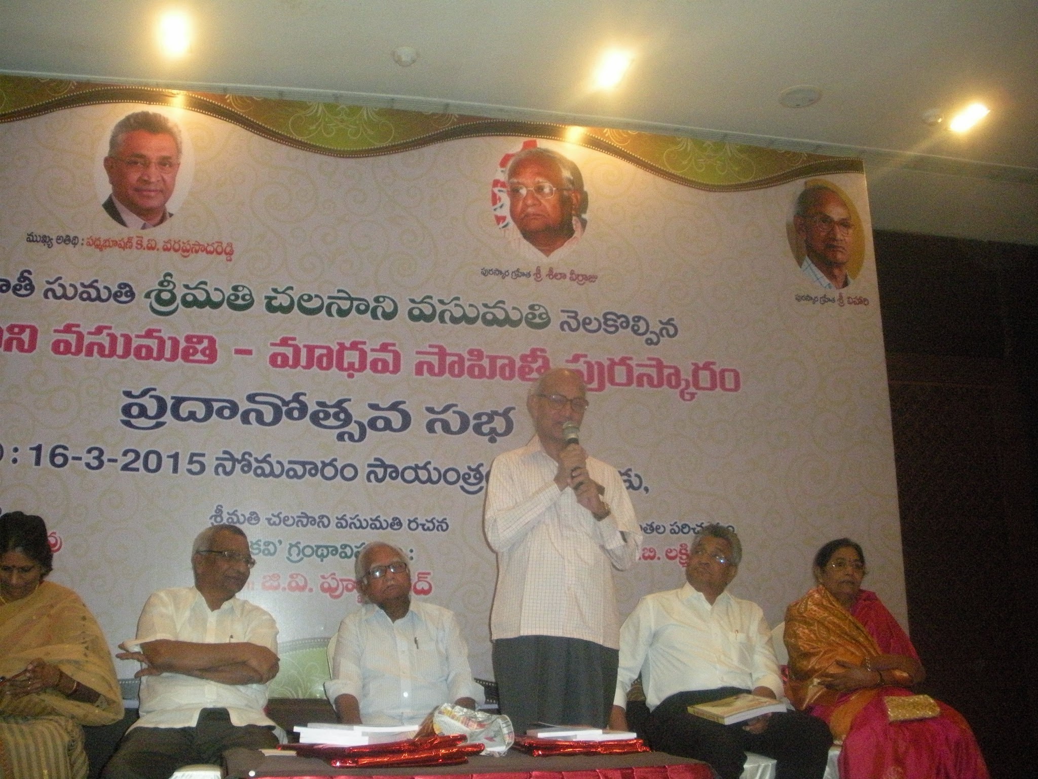 ← విజయవాడ ”మానర్ ఫుడ్ ప్లాజా ”లో 16-3-15 సోమవారం రాత్రి శ్రీమతి చలసాని వసుమతి గారు ,మహా కధకులు శ్రీ విహారి గారికి మహా చిత్రకారులు శ్రీ వీర్రాజు గారికి చెరొక 25,౦౦౦ రూపాయల నగదు ను ”వసుమతి -మాధవ ”పురస్కారం గా అంద జేసిన దృశ్యమాలిక