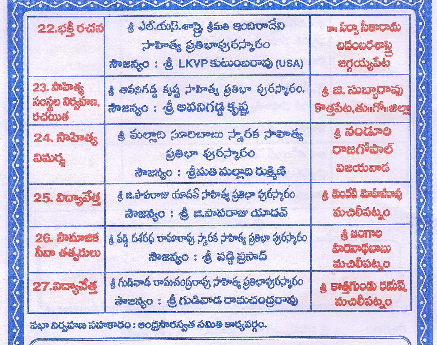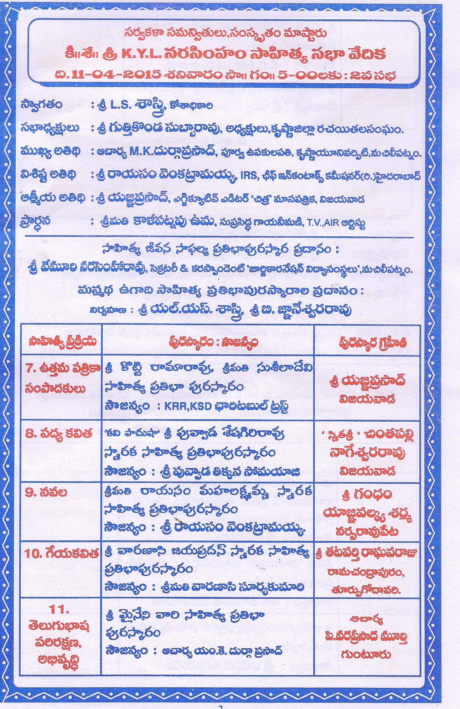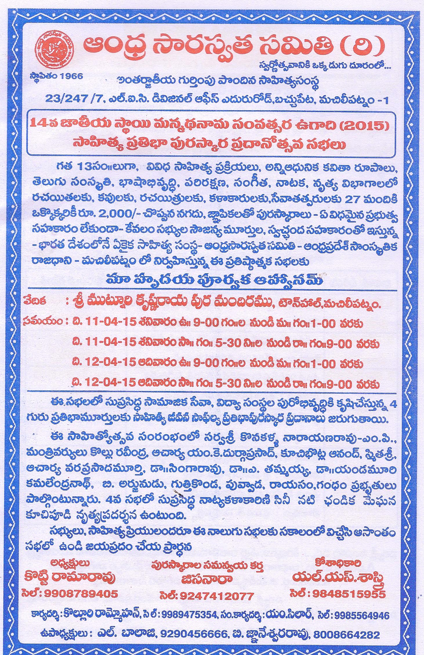 మచిలీ పట్నం లో ఆంద్ర సారస్వత సమితి ఉగాది పురస్కార ఆహ్వాన పత్రిక