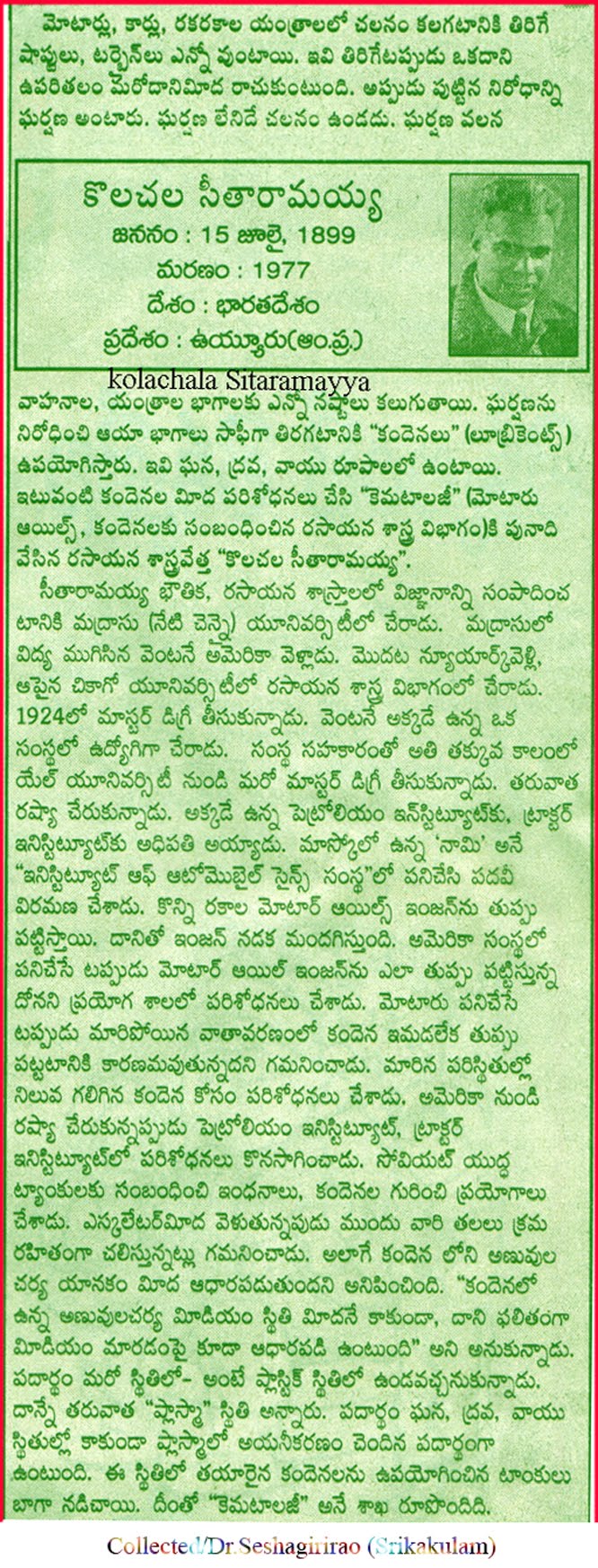 ’కెమోటాలజి పిత’’ కొలచల సీతా రామయ్య ‘32(’ పుల్లేరు నుండి ఓల్గా దాకా ’)(చివరిభాగం )