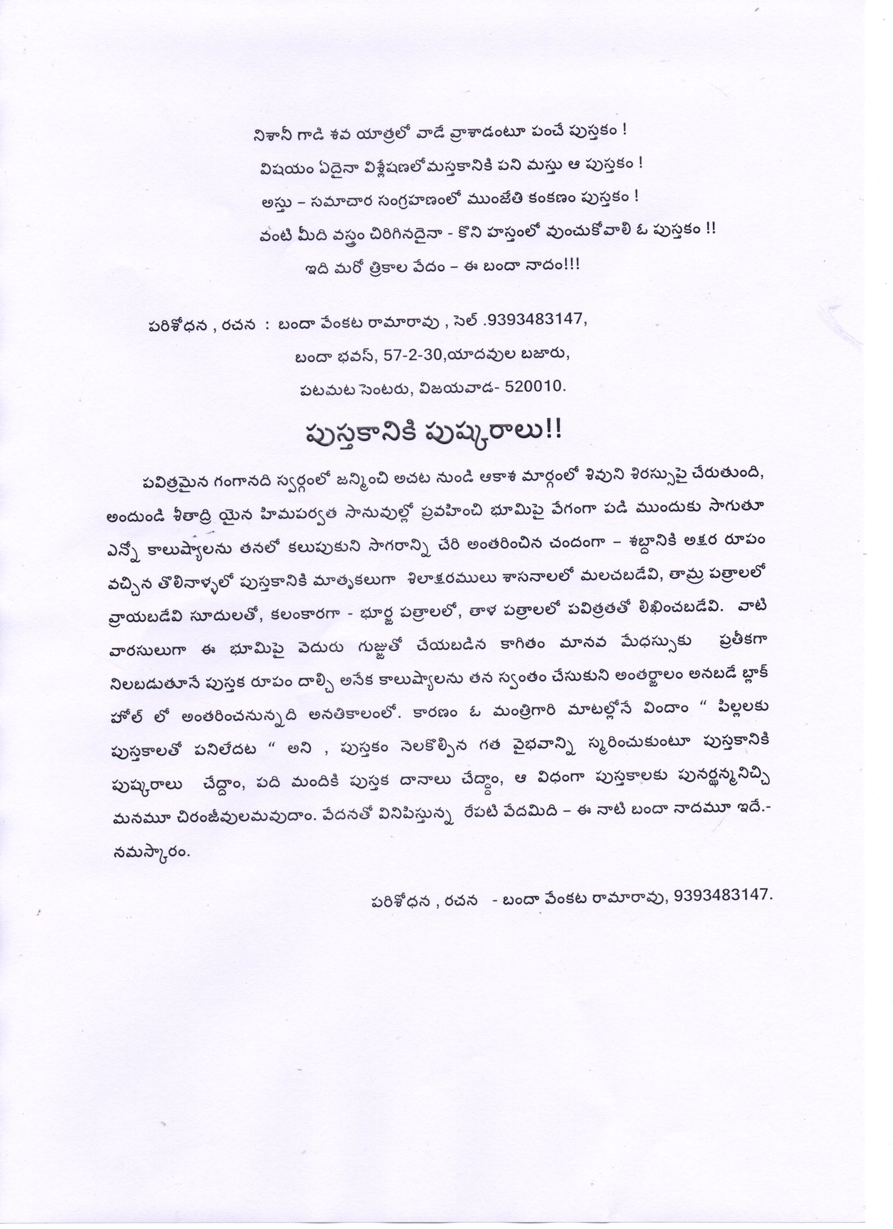 పుస్తక పురాణం మరియు పుస్తకానికి పుష్కరాలు – స్వీయ రచనలు – బందా