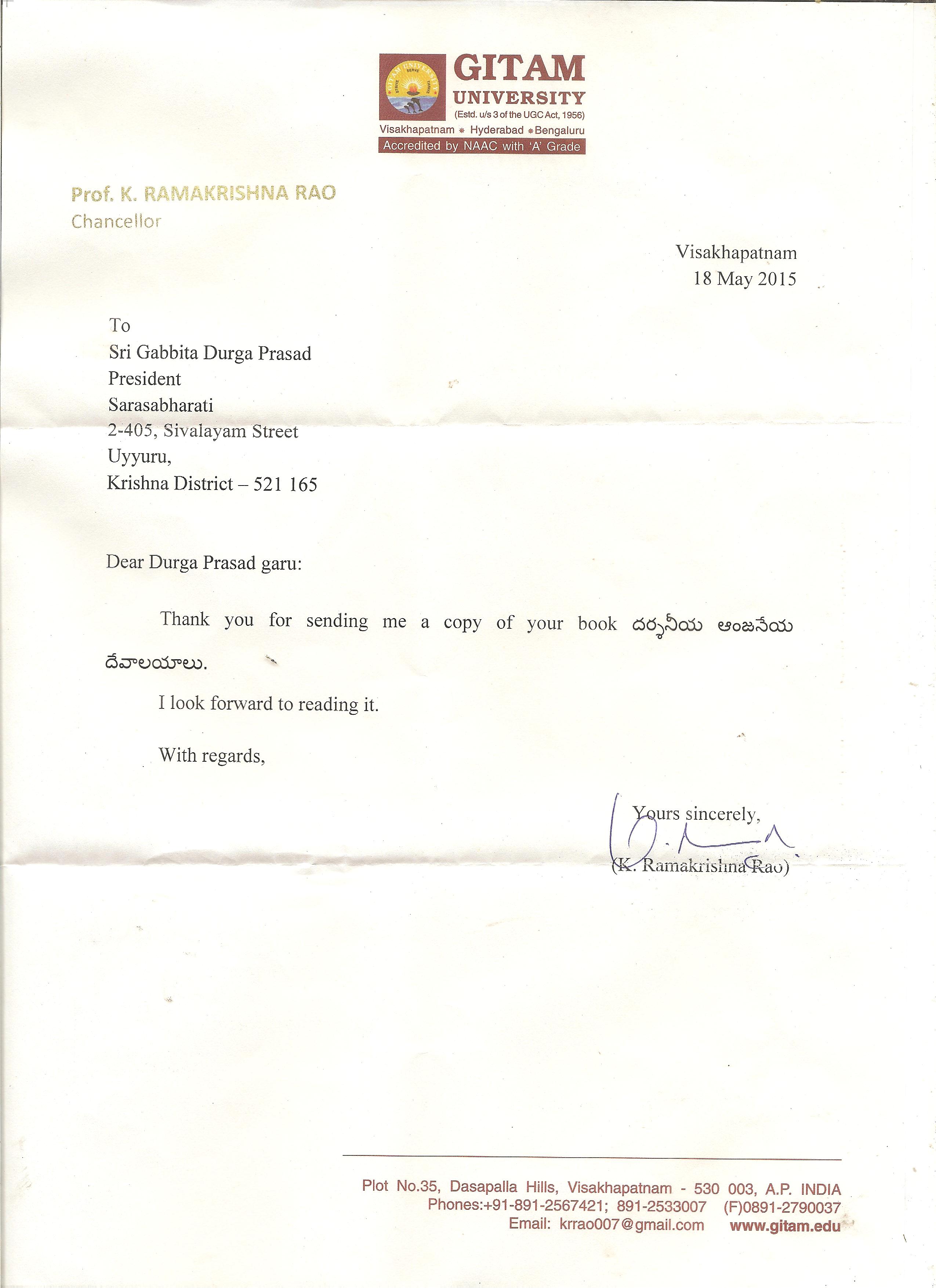 గీతం యూనివర్సిటి చాన్సెలర్ -పద్మశ్రీ డా . కోనేరు రామకృష్ణారావు గారి స్పందన