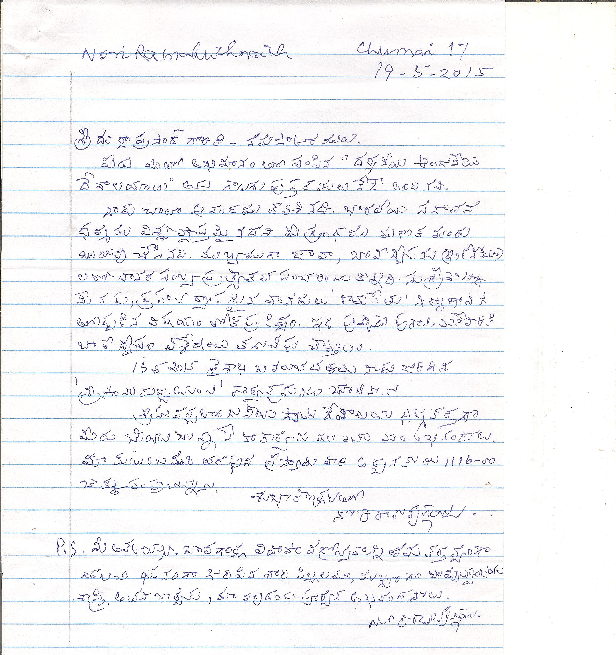 పెద్దలు శ్రీ నోరి రామకృష్ణయ్య (చెన్నై )గారి స్పందనnoriletter 001