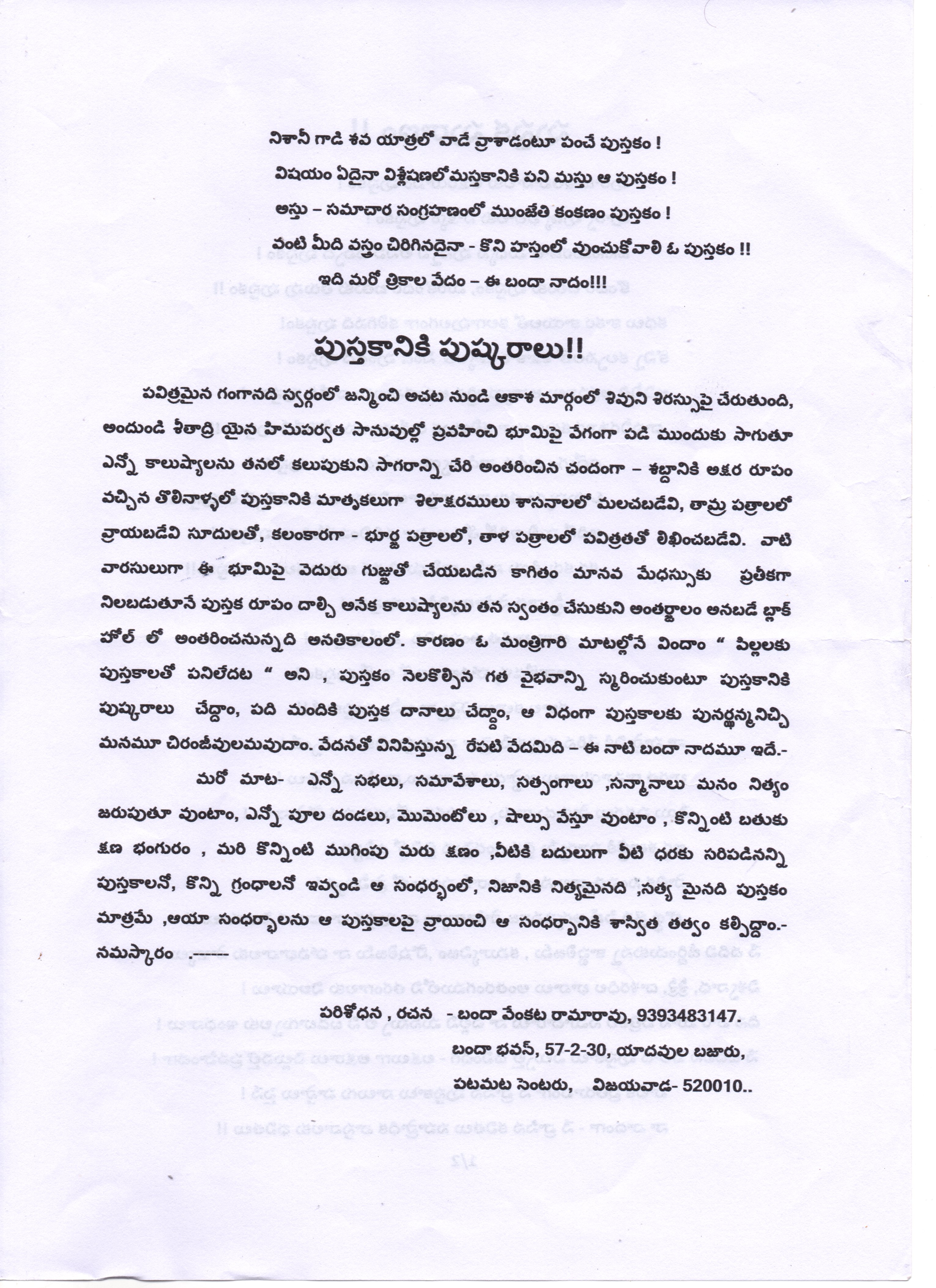 పుస్తక దినోత్సవ సంధర్భంలో నా అంతరంగములోని తరంగాలకు అక్షర రూపం – పుస్తక పురాణం మరియు పుస్తకానికి పుష్కరాలు – బందా