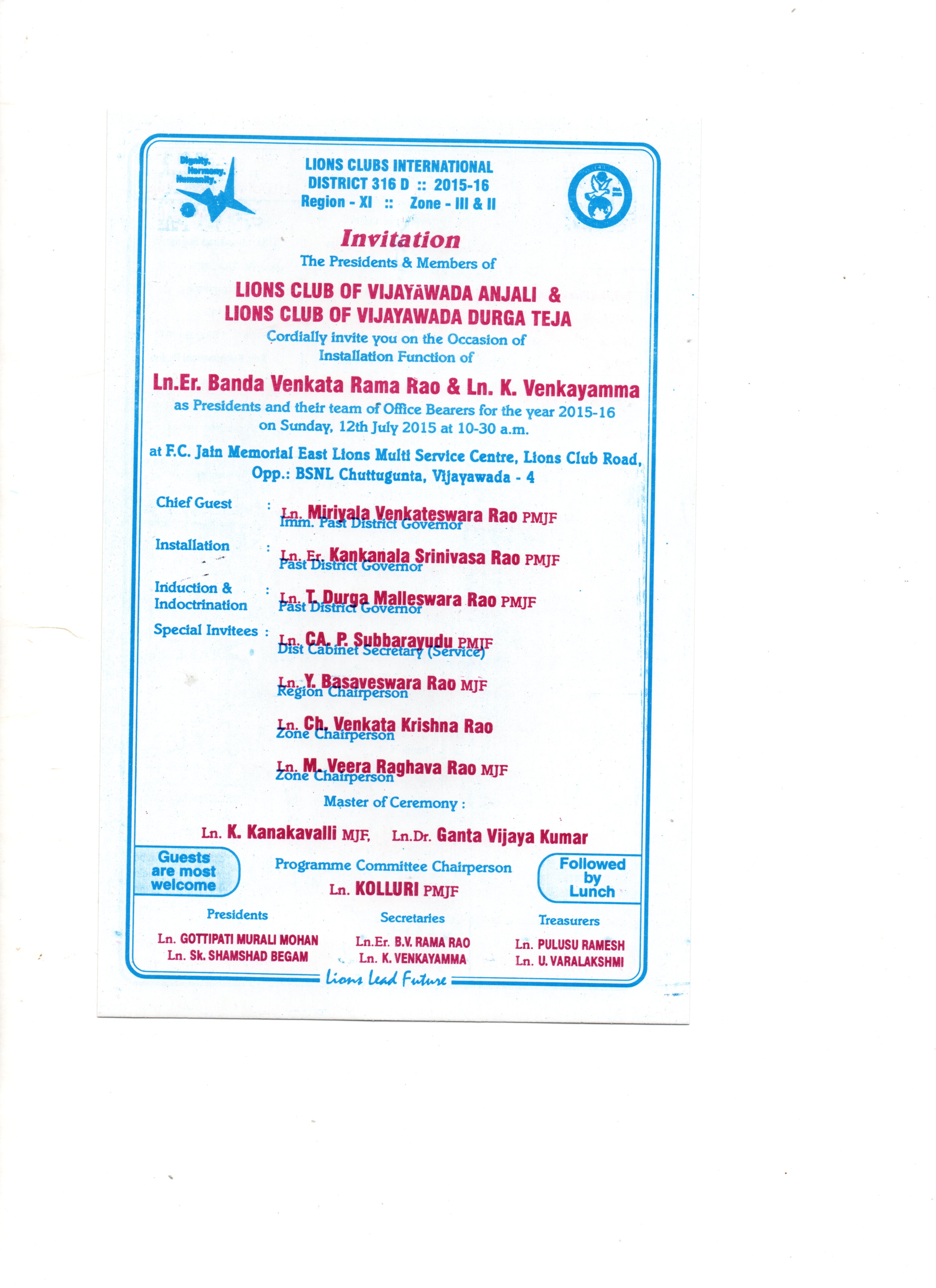 లయన్సు క్లబ్ ,విజయవాడ – అంజలి – అధ్యక్షునిగా ప్రమాణ స్వీకారమహోత్సవానికి ఆహ్వానం – బందా