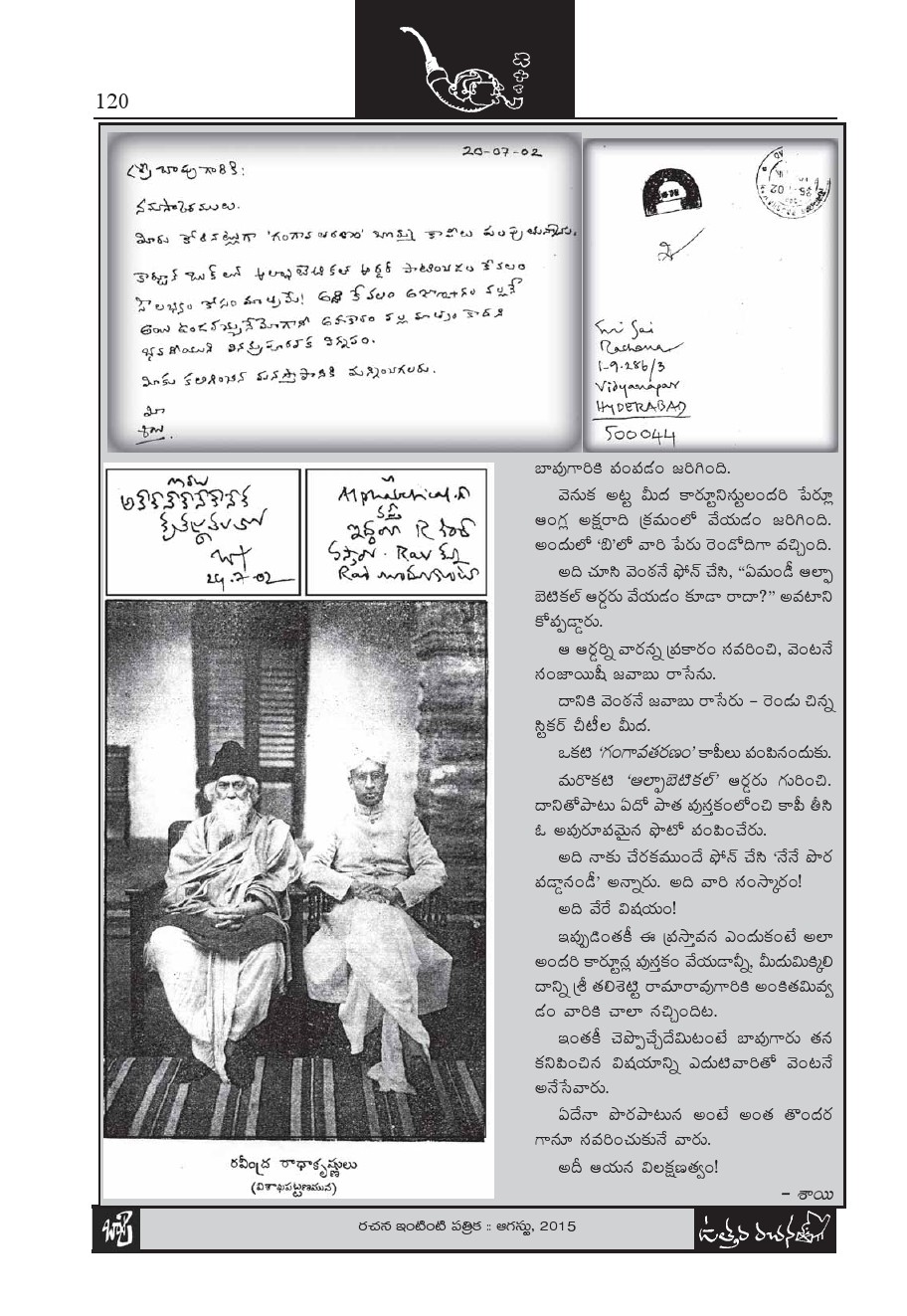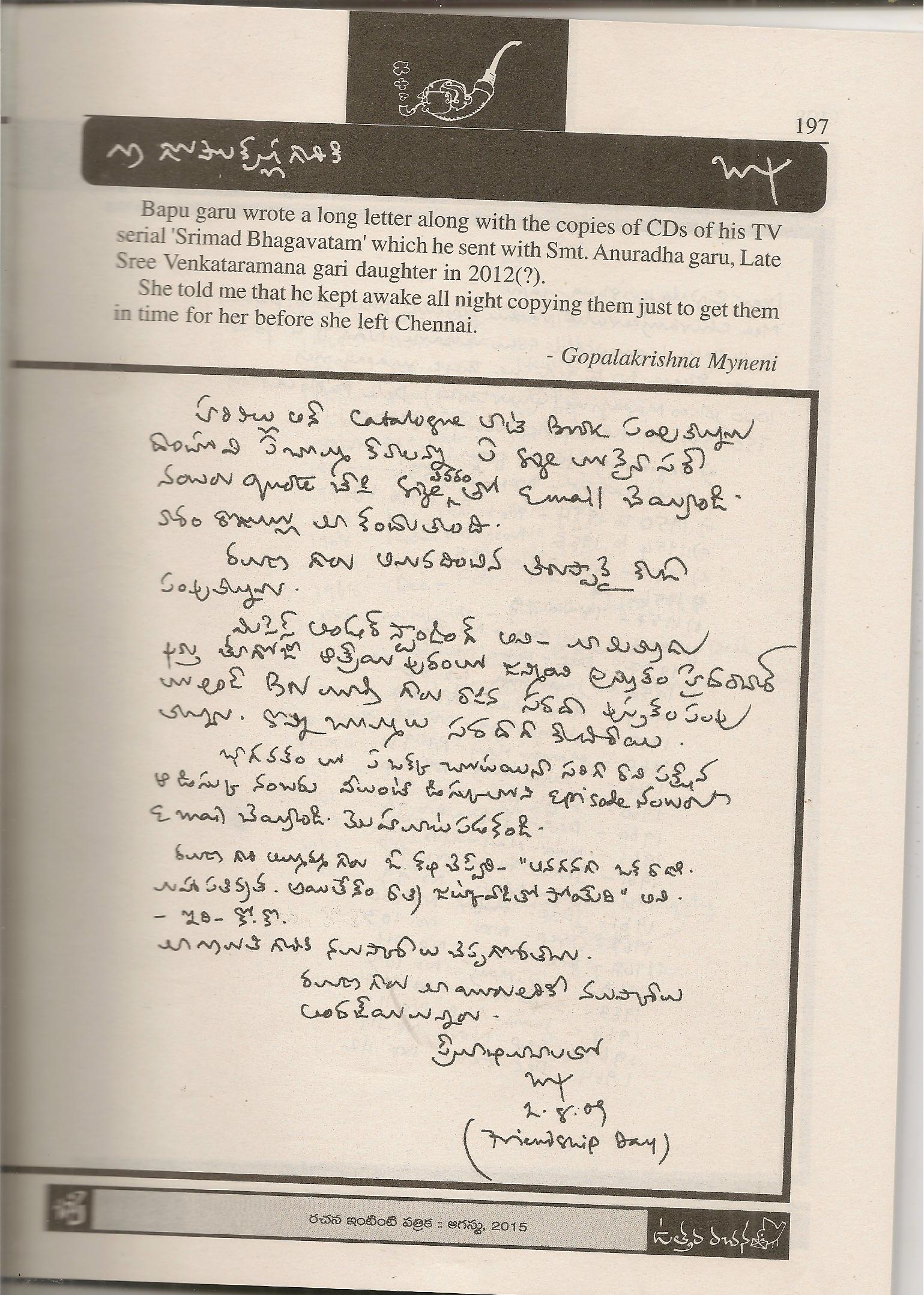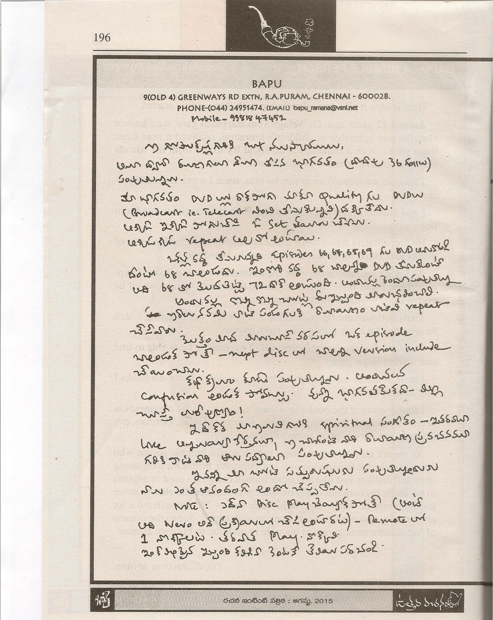 బాపు గారు నాకు రాసిన ఉత్తరం ,నేను రచన సాయి గారికి రాసిన జాబు