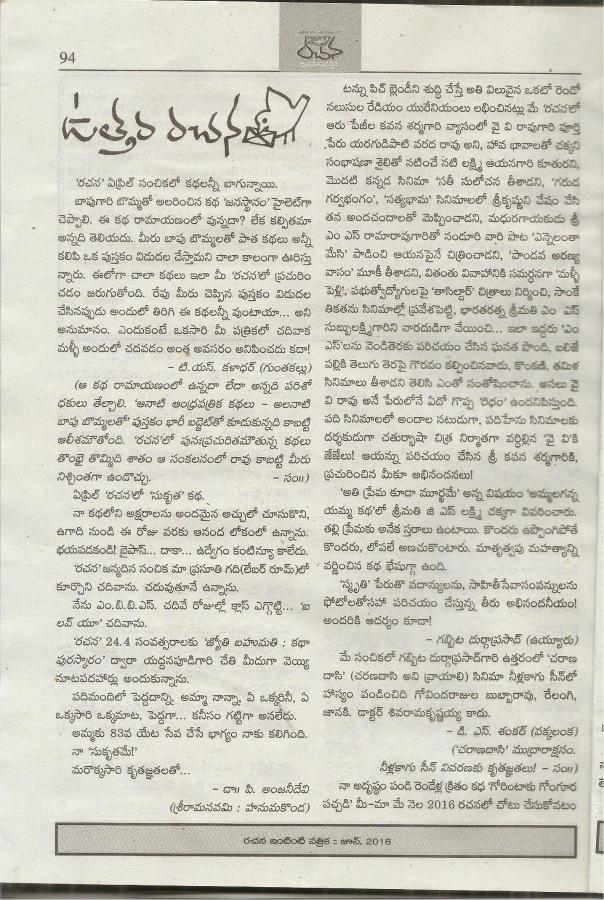 ← జూన్ నెల రచన మాసపత్రికలో దర్శకడు వై వి రావు పై శ్రీ కవన శర్మ రచనకు నా స్పందన లేఖ