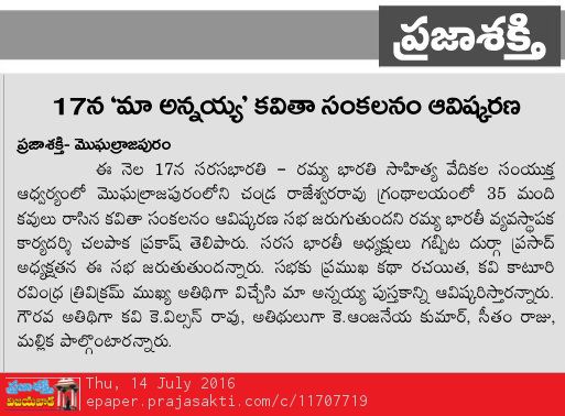 ← మా అన్నయ్య పుస్తకావిష్కరణ సభ 17-7-16 -ఆదివారం ఉదయం 10గం లకు మొగలరాజ పురం సి ఆర్ లైబ్రరీ లో