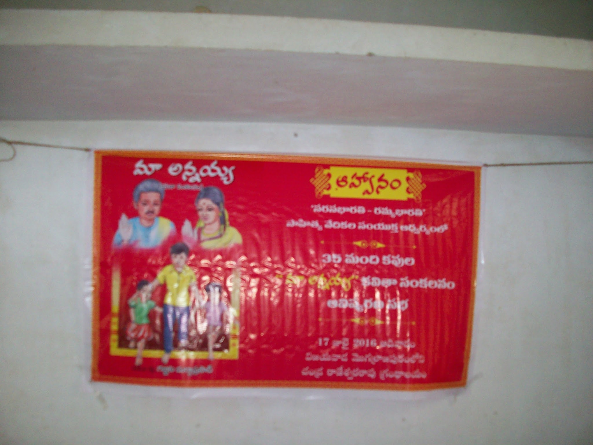← 17-7-16 ఆదివారం ఉదయం విజయవాడ మొగల్రాజ పురం సి ఆర్ లైబ్రరీలో శ్రీ కాటూరి రవీంద్ర త్రివిక్రమ్ గారిచే ”మా అన్నయ్య ”పుస్తకావిష్కరణ మరియు స్పాన్సర్ శ్రీమతి మల్లికాంబ గారి పుట్టినింట్లో భోజనాల చిత్రమాలిక