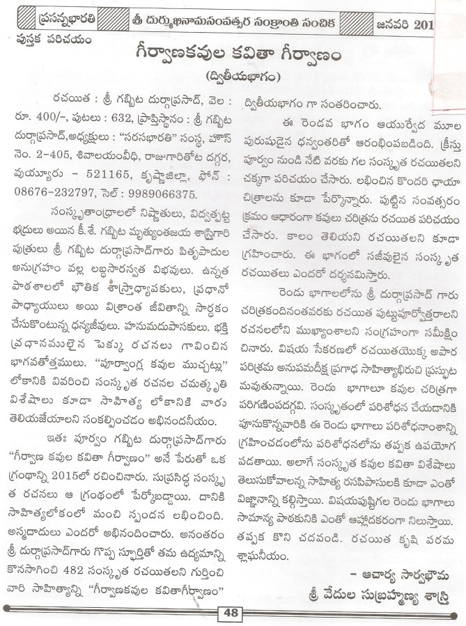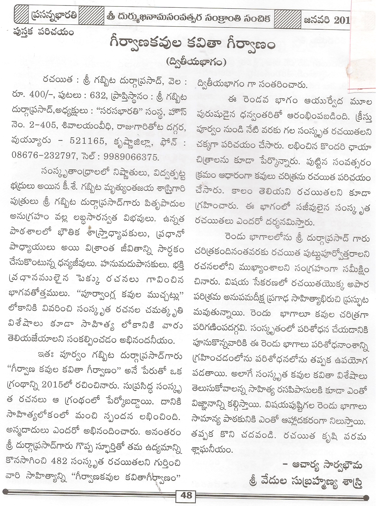 ← గీర్వాణం -2 పై విశాఖ నుండివెలువడే ”ప్రసన్నభారతి ”జనవరి సంచికలో ఆచార్య సార్వ భౌమ శ్రీ వేదులవారి సమీక్ష