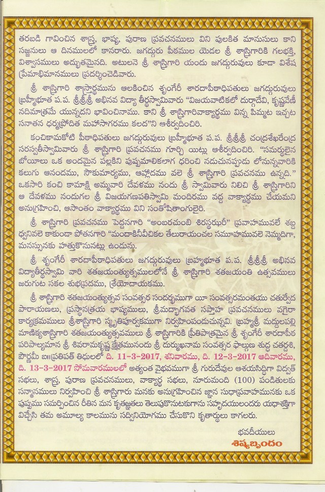 మహామహోపపాధ్యాయ శ్రీ మద్దులపల్లి మాణిక్య శాస్త్రిగారి శత జయంతి ఉత్సవాలు -11-3-17 -13-3-17 విజయవాడ శివరామకృష్ణ క్షేత్రం లో