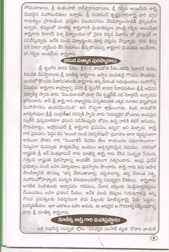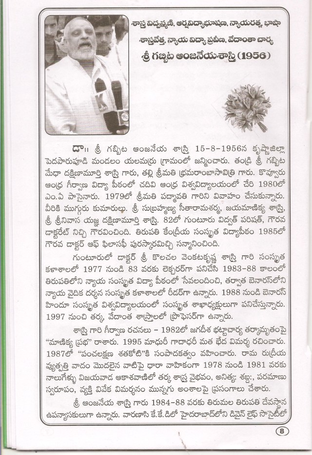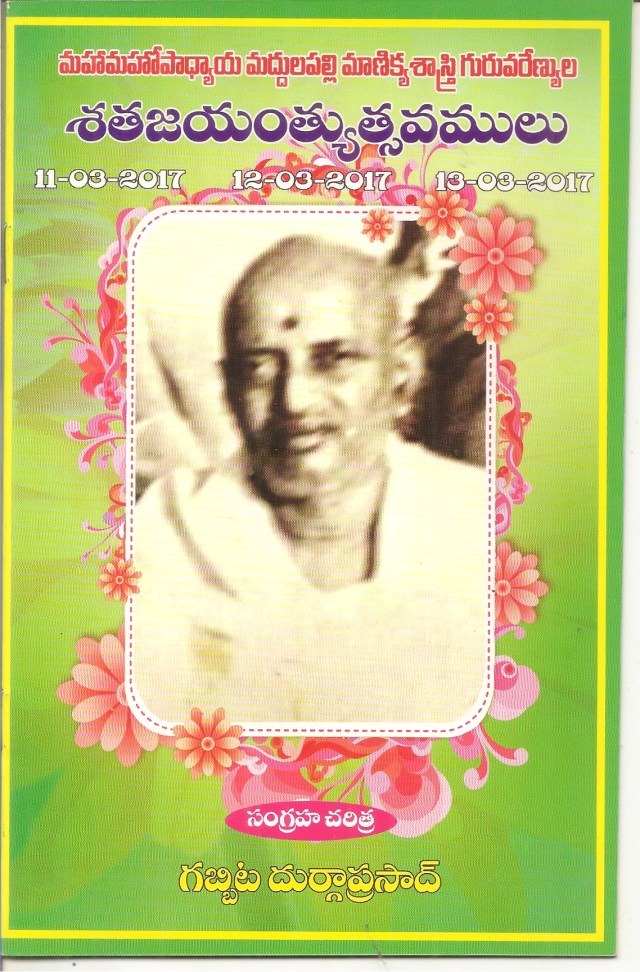 మహా మహోపాధ్యాయ స్వర్గీయ బ్రహ్మశ్రీ మద్దులపల్లి మాణిక్య శాస్త్రి గారి శత జయంతి ఉత్సవాలు విజయవాడ శివ రామ క్షేత్రం లో 11-3-17 నుండి 13-3-17 వరకు వారి శిష్యులలో ప్రముఖులు శాస్త్ర విద్వన్మణి,ఆర్ష విద్యాభూషణ ,న్యాయ రత్న ,భాషా శాస్త్ర వేత్త ,న్యాయ విద్యా ప్రవీణ, వేదా౦తాచార్య ప్రస్తుత బెనారస్ హిందూ సంస్కృత విశ్వ విద్యాలయ న్యాయ శాఖ ఆచార్యులైన డా శ్రీ గబ్బిట ఆంజనేయ శాస్త్రి గారు మొదలైన శిష్య బృందం ఘనం గా నిర్వ హిస్తున్న సందర్భం గా , శ్రీ మాణిక్య శాస్త్రి గారి జీవితం, సాహిత్యం పైనా ,శ్రీ ఆంజనేయ శాస్త్రి గారి జీవిత సాహిత్యాలపైన నేను ”గీర్వాణకవుల కవితా గీర్వాణం -రెండవ భాగం ”లో రాసిన వ్యాసాలను సంగ్రహించి ,కొత్త విషయ విశేషాలు చేర్చి రాయగా ప్రత్యేక బుక్ లెట్ గా సరస భారతి తరఫున స్వంత ఖర్చులతో శ్రీ గబ్బిట ఆంజనేయ శాస్త్రి గారు ప్రచురించి మొదటి రోజు 11-3-17 శనివారం శ్రీ మాణిక్య శాస్త్రిగారి పెద్దకుమారుల చేత ఆవిష్కరింప జేసి సభ లో పాల్గొన్న వారందరికీ ఉచితం గా అందజేసి తమ గురు భక్తిని చాటుకున్నారు . ఇందులో నాది ఉడత సాయం మాత్రమే -మీ దుర్గా ప్రసాద్