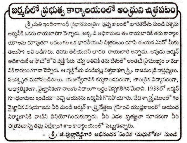 తూర్పు గోదావరిజిల్లా రాజమండ్రి కి చెందిన బ్రహ్మశ్రీ దండి భొట్ల విశ్వనాధ శాస్త్రిగారు బాల మేధావి .చిన్నతనం లోనే తర్క ,వ్యాకరణ ,మీమా౦స లను మదించి ,యజుర్వేద కర్మకాండ ,అధర్వవేద మంత్రప్రయోగ భాగాలపై సాధికారత సాధించారు .అధర్వ వేదం లో రహస్యంగా నిక్షిప్తమై ఉన్న తంత్ర ,మంత్ర శాస్త్ర రహస్యాలను క్షుణ్ణంగా అధ్యయనం చేశారు .1930 లలో మొదటి ప్రపంచ యుద్ధసమయం లో జర్మనీ పరభుత్వ ఆహ్వానం పై జర్మనీ వెళ్లి అక్కడ వారు తయారు చేస్తున్న మిసైల్ టెక్నాలజీ కి రహస్య మంత్రాలను డీకోడ్ చేయటానికి సహాయ పడ్డారు .దీనికి కృతజ్ఞతగా ఫ్రాంక్ ఫర్ట్ యూని వర్సిటీ లో ఆయన చిత్రపటాన్ని అత్యంత గౌరవ స్థానం లో ఉంచారు .జర్మన్ పార్లమెంట్ లోని ‘’హాల్ ఆఫ్ ఫేం ‘’లో ఆయన పేరును చేర్చి అత్యంత గౌరవం చూపించారు .