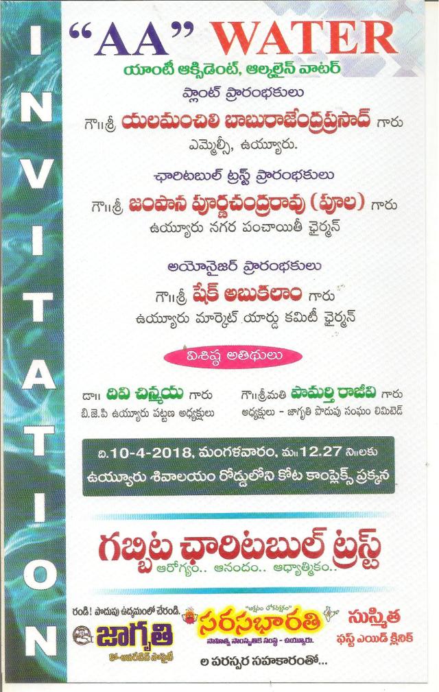 ”గబ్బిట చారిటబుల్ ట్రస్ట్” ఆధ్వర్యం లో రేపు 10-4-18 మంగళవారం ఏ ఏ వాటర్ ప్లాంట్ ప్రార0భోత్సవ ఆహ్వానం