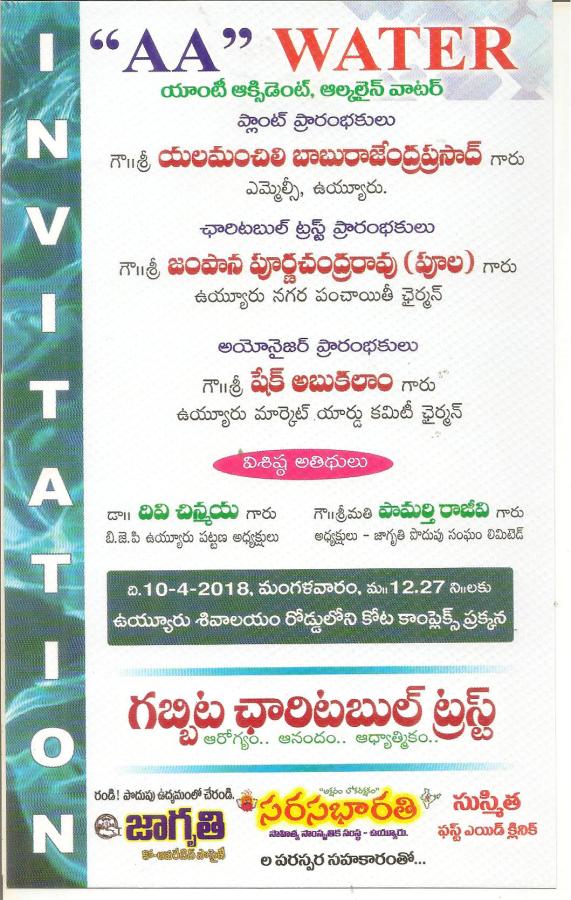 ← ”గబ్బిట చారిటబుల్ ట్రస్ట్” ఆధ్వర్యం లో రేపు 10-4-18 మంగళవారం ఏ ఏ వాటర్ ప్లాంట్ ప్రార0భోత్సవ ఆహ్వానం