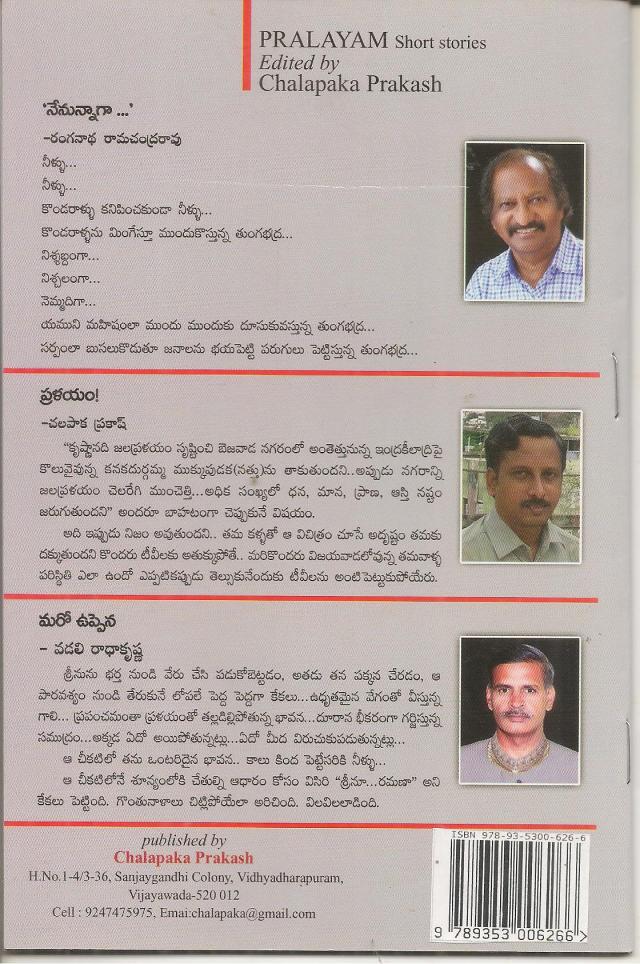 చాలాకాలం క్రితం శ్రీ సా. వేం .రమేష్ ‘’ప్రళయ కావేరి ‘’కధలు రాసి సంకలనంగా తెచ్చి బహు కీర్తి నార్జించారు .కృష్ణా జిల్లా శ్రీకాకుళం వాస్తవ్యులు కవి, కథా , నాటక రచయిత శ్రీ పోలవరపు కోటేశ్వరరావు గారు అక్కడి కృష్ణా నది వరదలపై చక్కని కథలు రాసి మెప్పు పొందారు .దివిసీమ ఉప్పెన పై ఎన్నో కథలు, గాథలు , దీర్ఘ కవితలు వెల్లువలా వచ్చాయి .రమ్య భారతి సంపాదకులు ,ఆంధ్రప్రదేశ్ రచయితల సంఘ ప్రధాన కార్యదర్శి ,కవి, కథకుడు, విమర్శకుడు శ్రీ చలపాక ప్రకాష్ ఇప్పటికే ‘’ప్రళయం ‘’నేపధ్యంగా రెండు కథా సంకలనాలు ప్రచురించి ,మూడవ సంకలనం గా ముగ్గురు రాసిన మూడే మూడు కథలతో ‘’మూడవ ప్రళయం ‘’సృష్టించి ఈ ఏప్రిల్ లో ఆవిష్కరణ జరిపారు .ముచ్చటైన ముఖచిత్రం తో ,ప్రళయం సృష్టించిన దృశ్యాలతో లోపలి అంశాలకు ఆనవాలుగా పుస్తకం బాగుంది . ఏదో పని మీద నిన్న మా ఇంటికి వచ్చి ‘’ప్రళయం ‘’తో పాటు మరికొన్ని పుస్తకాలు ఇచ్చి వెళ్ళారు .ఇవాళే అన్నీ చదివేశాను .